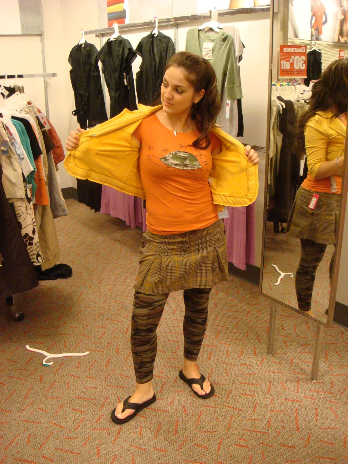 Moving on, we then encountered the women’s clothing section where we both simultaneously spotted a pair of camouflage tights. I might as well present my bias right now – I’m a sucker for camo and think there are few situations that cannot be improved by a dose of camo. Cut to us dressing my roommate up like a doll – a doll with the most ridiculous outfit we could put together. This exercise in absurdity ate up at least twenty minutes and was again filled with a great deal of laughter and good times.