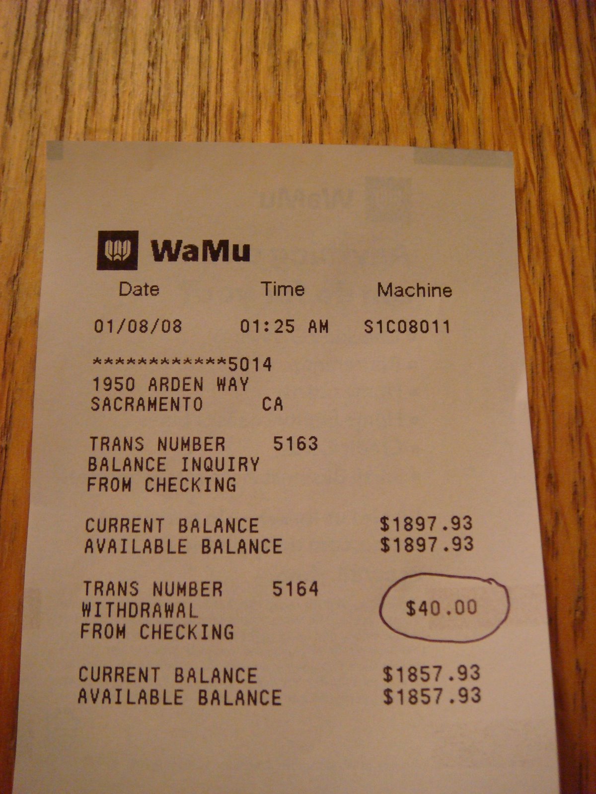 So, it wasn’t quite $200, but I just got a free $20 from a Washington Mutual ATM. Has this ever happened to any of you, dear readers? Oh, I checked and only $40 was debited from my account. Pretty awesome…