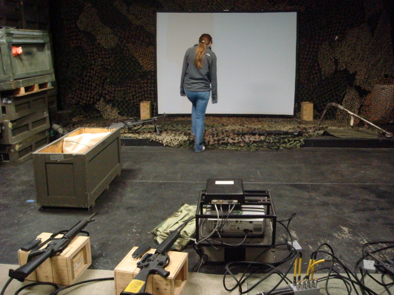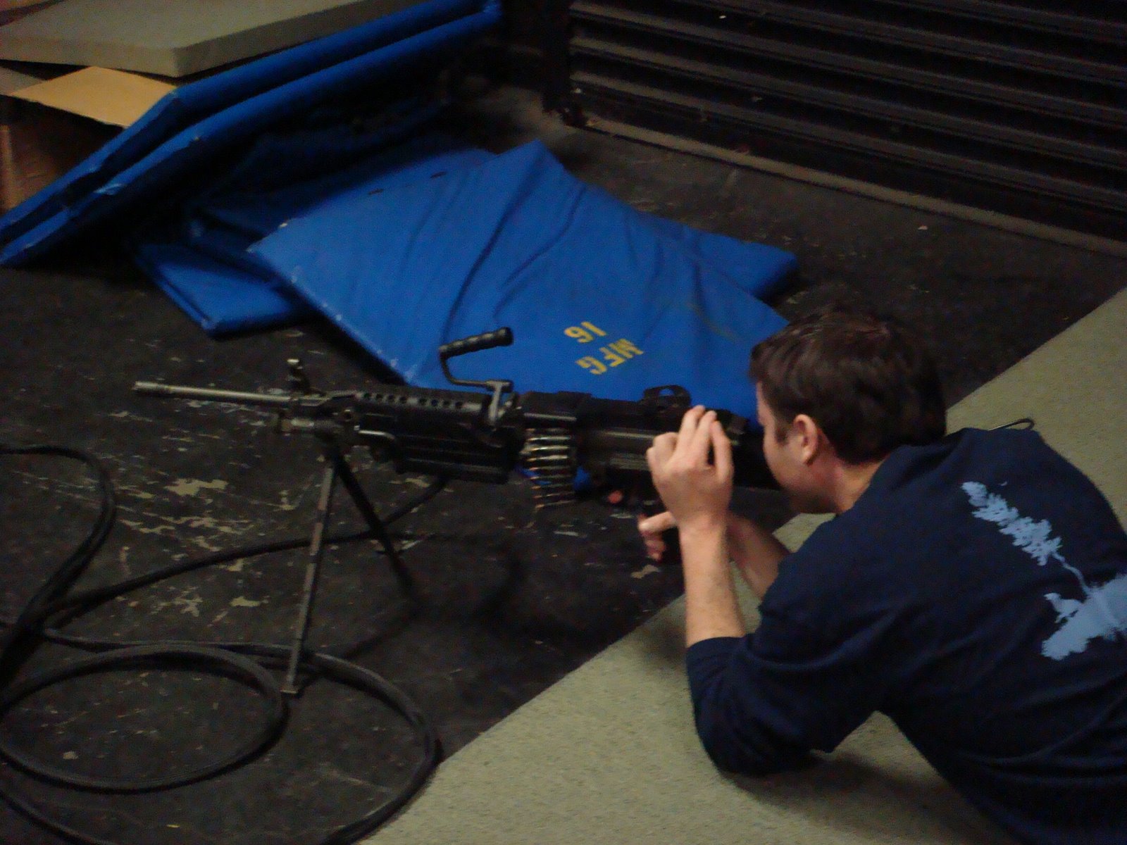 Here Brandon and I counter an ambush from a small craft. The guns have a sophisticated pneumatic system that provides a realistic recoil as you are firing. I hurt my collar bone a couple of times by holding the gun too closely to that poorly protected bone. Also, the guns jam and require reloading just as they would if one were firing live ammunition…