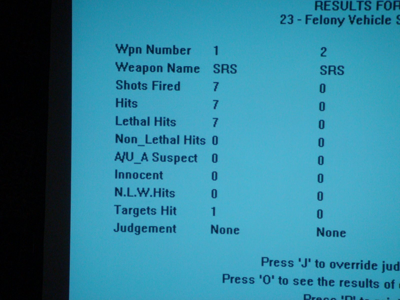 After a scenario is completed, the computer lists your specific stats on the screen. Below are the details of my performance on a felony vehicle stop. I hit the target 7 out of 7 times and all of my hits were lethal shots…