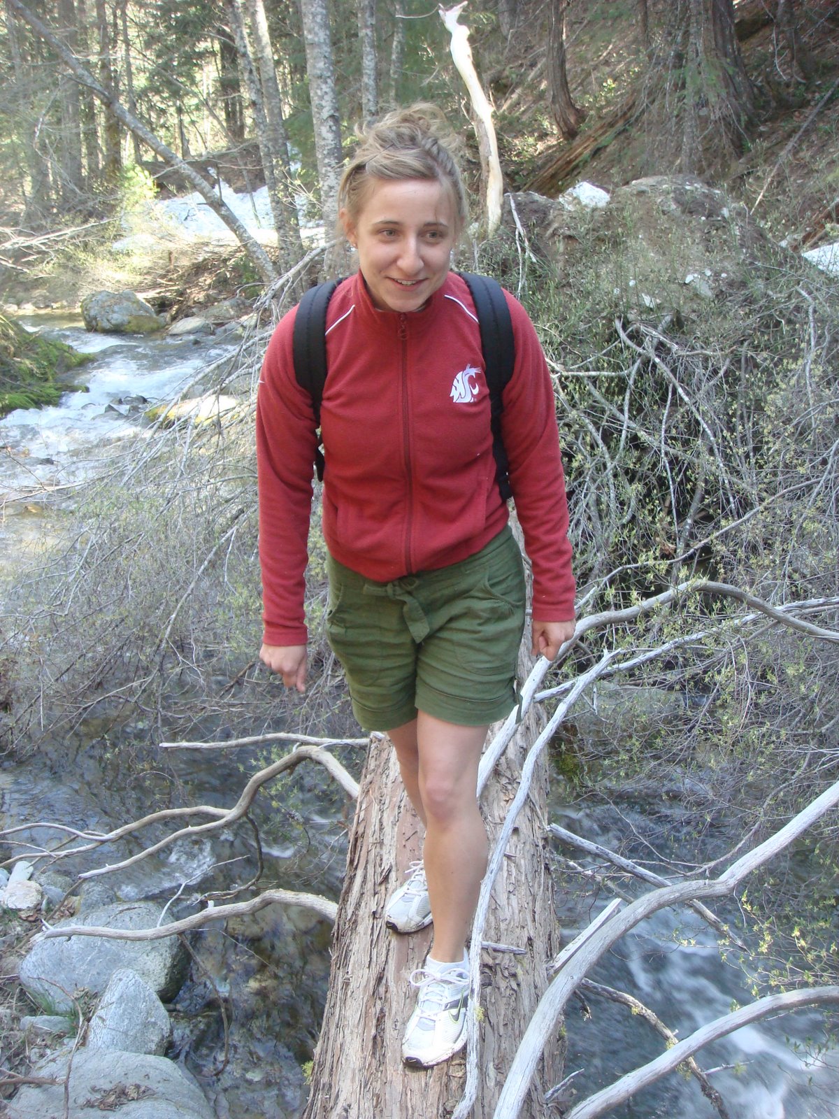 There’s a log slightly upstream, you can cross on to avoid becoming saturated in the freezing water… I think this was the first incident of Molly hating me on this day: