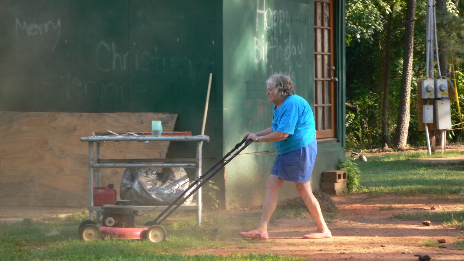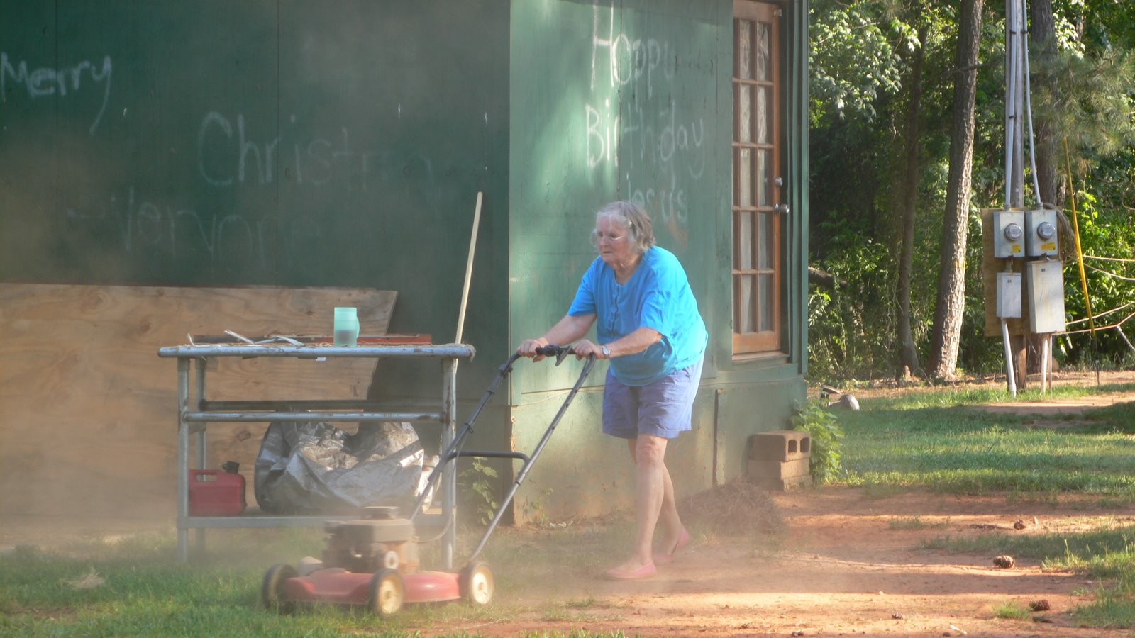 Here we have granny mowing the dirt in a typical trailer park. I strongly encourage you to click on the pictures to bring them to full size, so you can really appreciate the expressions on the faces of the individuals pictured below. And don’t miss the writing on the trailer granny is mowing in front of either.