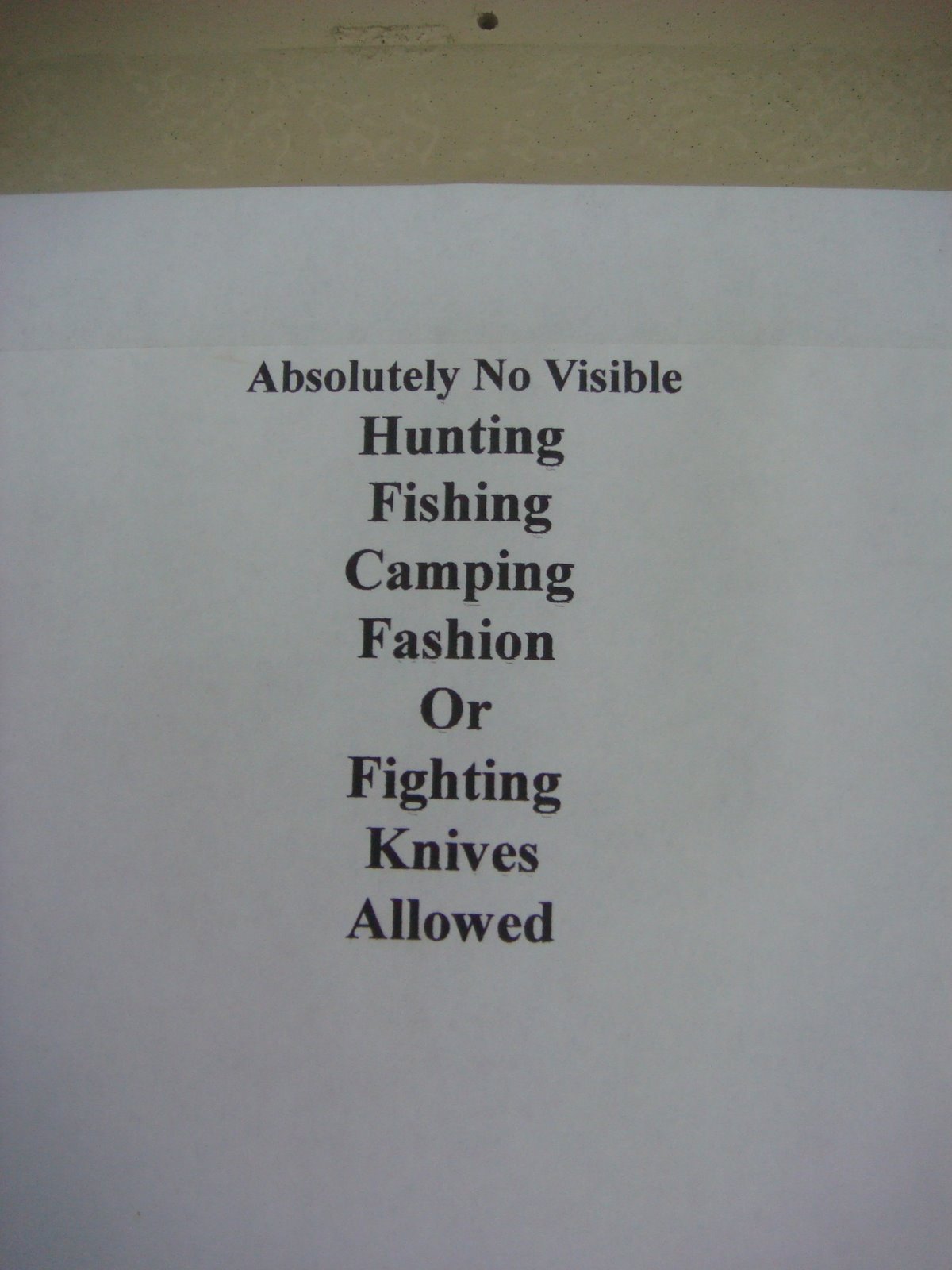 This sign was on the door of a strip club we passed. Notice how it says “no visible knives”. In other words, it’s OK to have a concealed weapon, you just can’t let anyone see it: