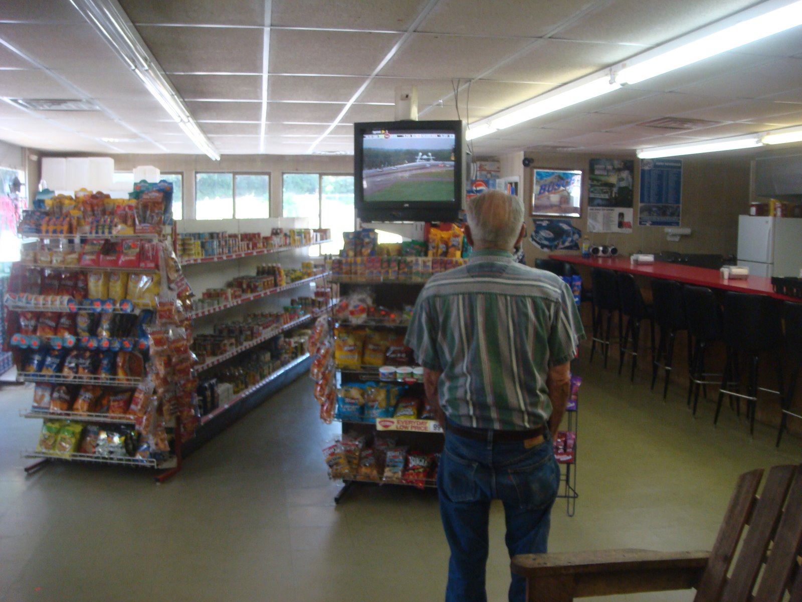 We stopped at a gas station/jerky shop for fuel and as I mentioned in my previous Southern Exposure posting, gas stations are the cultural centers of most of the small towns in the rural South. This being no exception, a small crowd was sitting and standing around watching NASCAR on this small television: