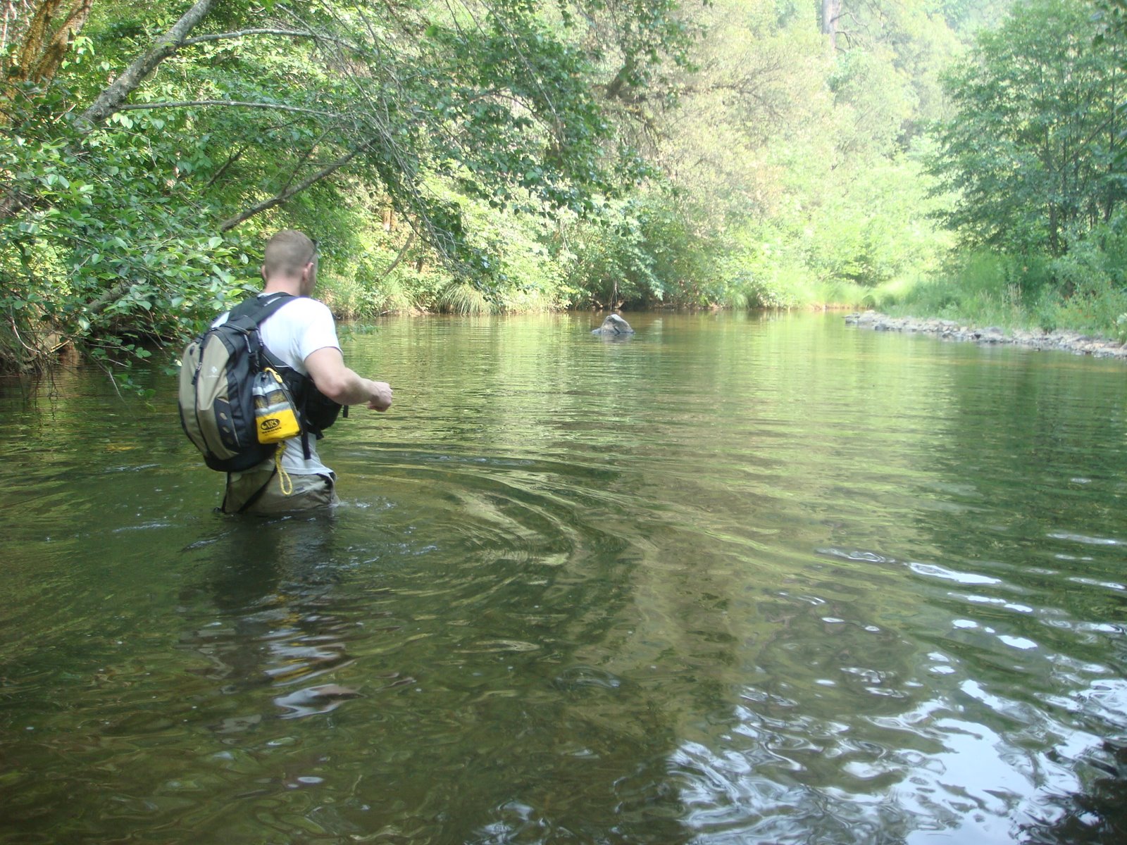 Brandon demonstrates the force of the water even in an environment of unusually low water levels