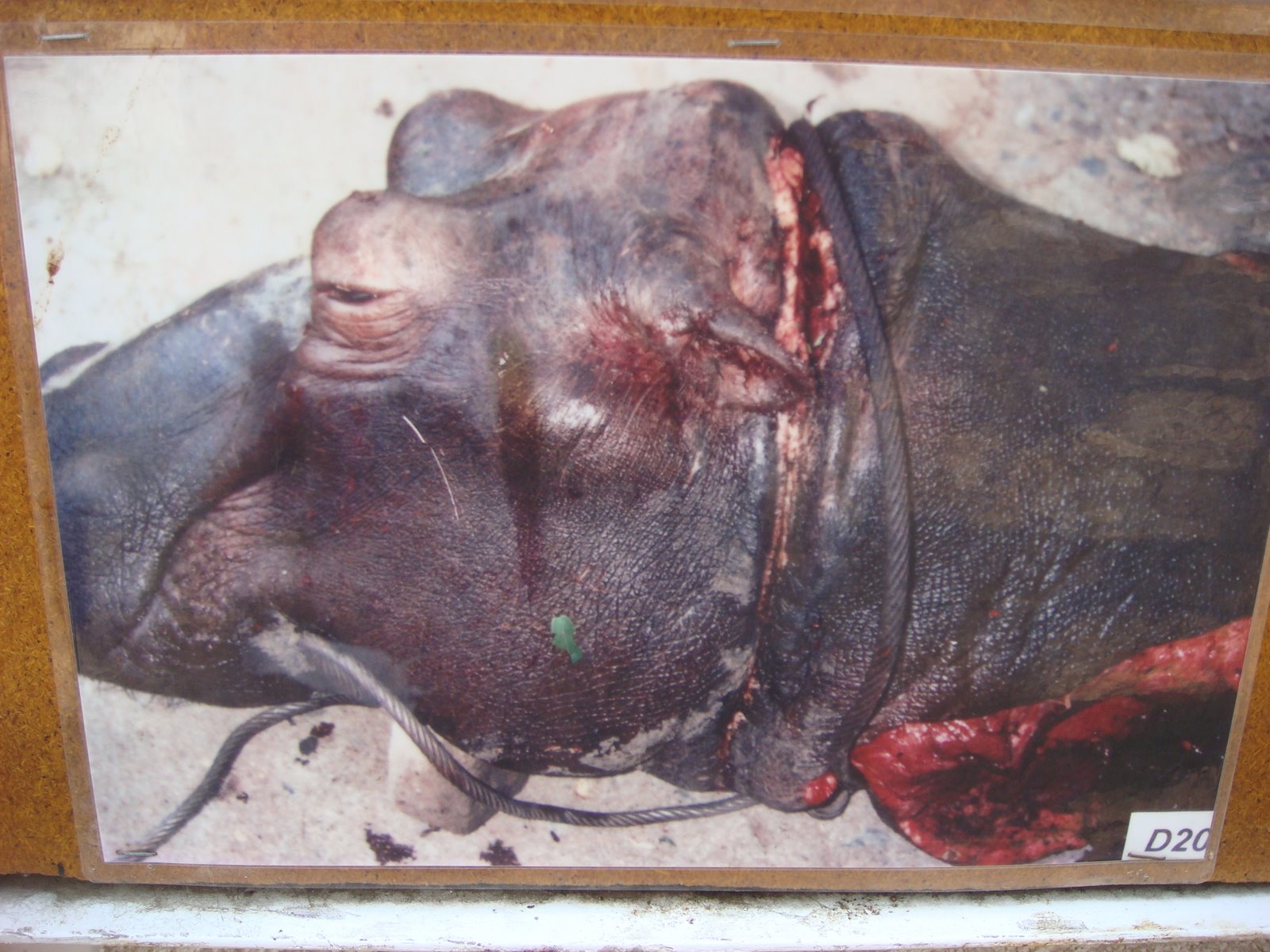 A white rhino killed by a barbed wire snare. Note the small amount of meat taken. This animal was killed for profit and not to feed someone’s starving family.