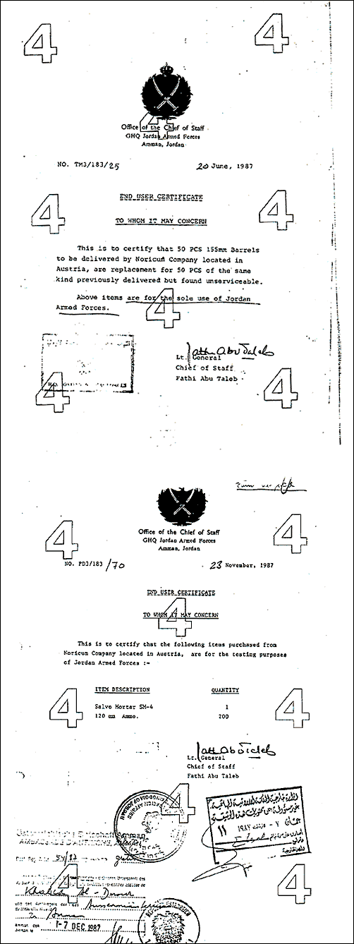 The end-user certificate in this example covered shipments of weapons from Austria in the 1980s to the Royal Jordanian Army. Actually, the Austrian weapons — ranging from mortars to advanced long-range artillery and ammunition — were transshipped through Jordan to Saddam Hussein’s Iraq.