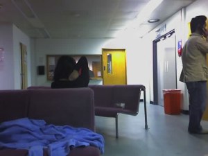 During our time in the detention facility, the guards changed several times and I soon learned to assess the psychology of each guard carefully to measure what I could get out of them. One of the guards really didn’t like Arab women, but was very generous in handing out drinks and sandwiches and letting people bring in small things like books. After a cursory examination, another guard let me bring my coat inside (it was really cold in there). He missed my mobile phone (electronic devices were not allowed) and I was able to take these two pictures (Honestly, who else do you know that would smuggle pictures out from inside a detention facility?):