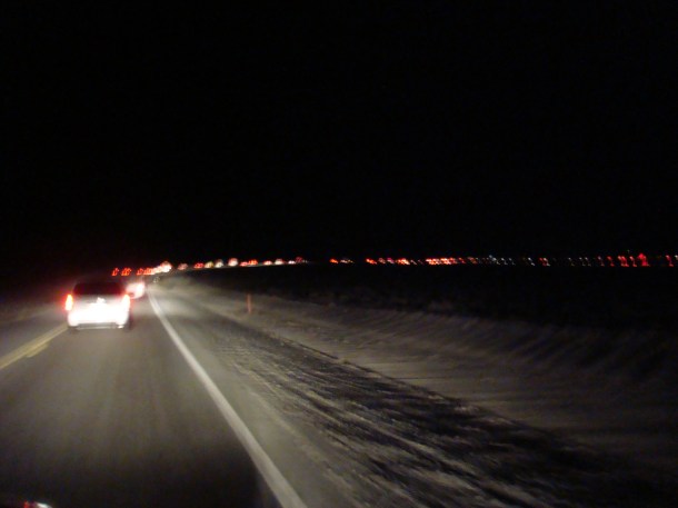 Just as it started to get dark, we were stopped about eight miles from the entrance along with everybody else in this line. The reason, as it turned out, was that a massive windstorm was sweeping across “Black Rock City” (temporarily the third largest city in Nevada) generating whiteout conditions.