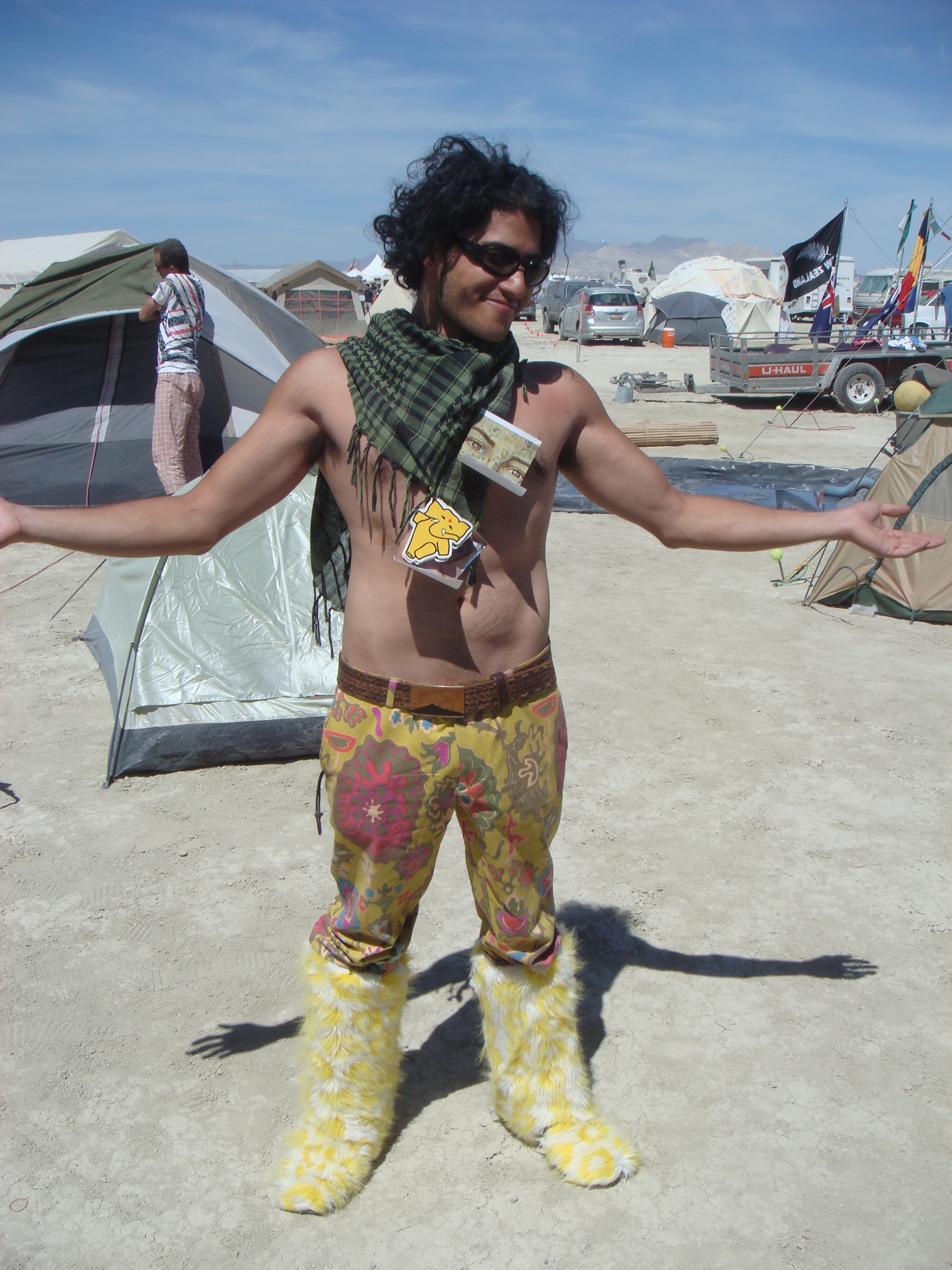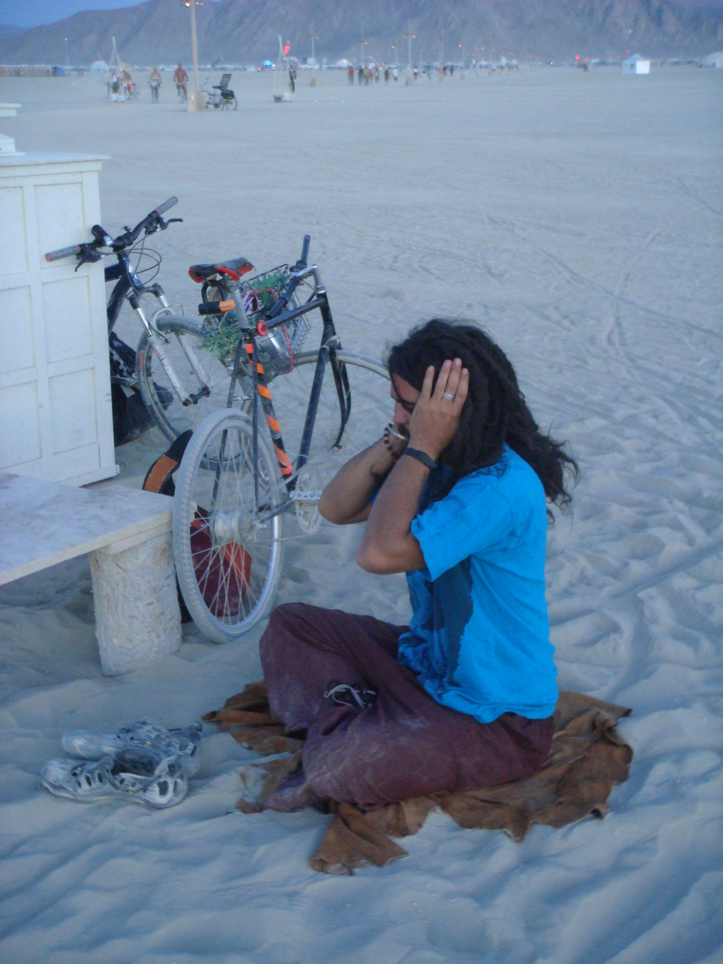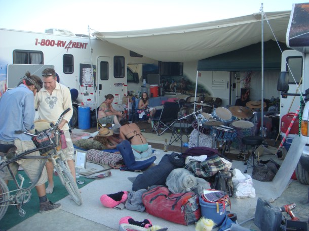As luck would have it, Jael lost her ticket in the windstorm as we were driving in (which I can’t fault her for because mine blew out the window and I had to go scampering across the desert after it) and so Jael and Brandon had to stop and spend several hours at the entrance sorting things out. As we had a truck, Hans and Sara Rose (and by now Hans’ roommate Roxy who had joined us) immediately pressed the truck into service by saying that if we would rescue them from that situation, that they’d take us to a great campsite and a cool crew. Jackpot. Ian and I didn’t know shit about how things worked and so were more than happy to be mentored by Hans.