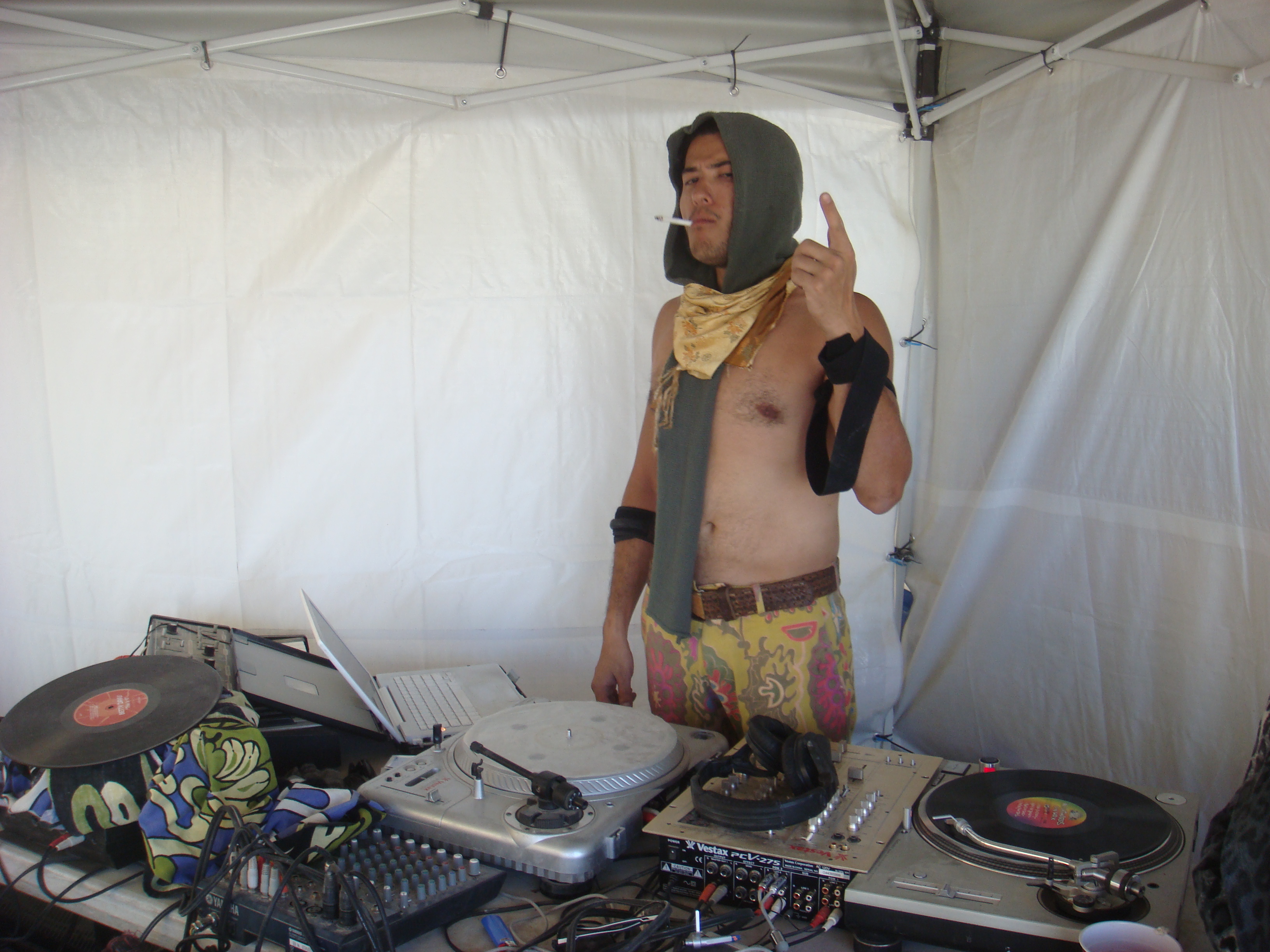 The Hot Love Brigade camp was well equipped and the various DJ aspirants took turns keeping good music flowing. Here Karim is having a go.