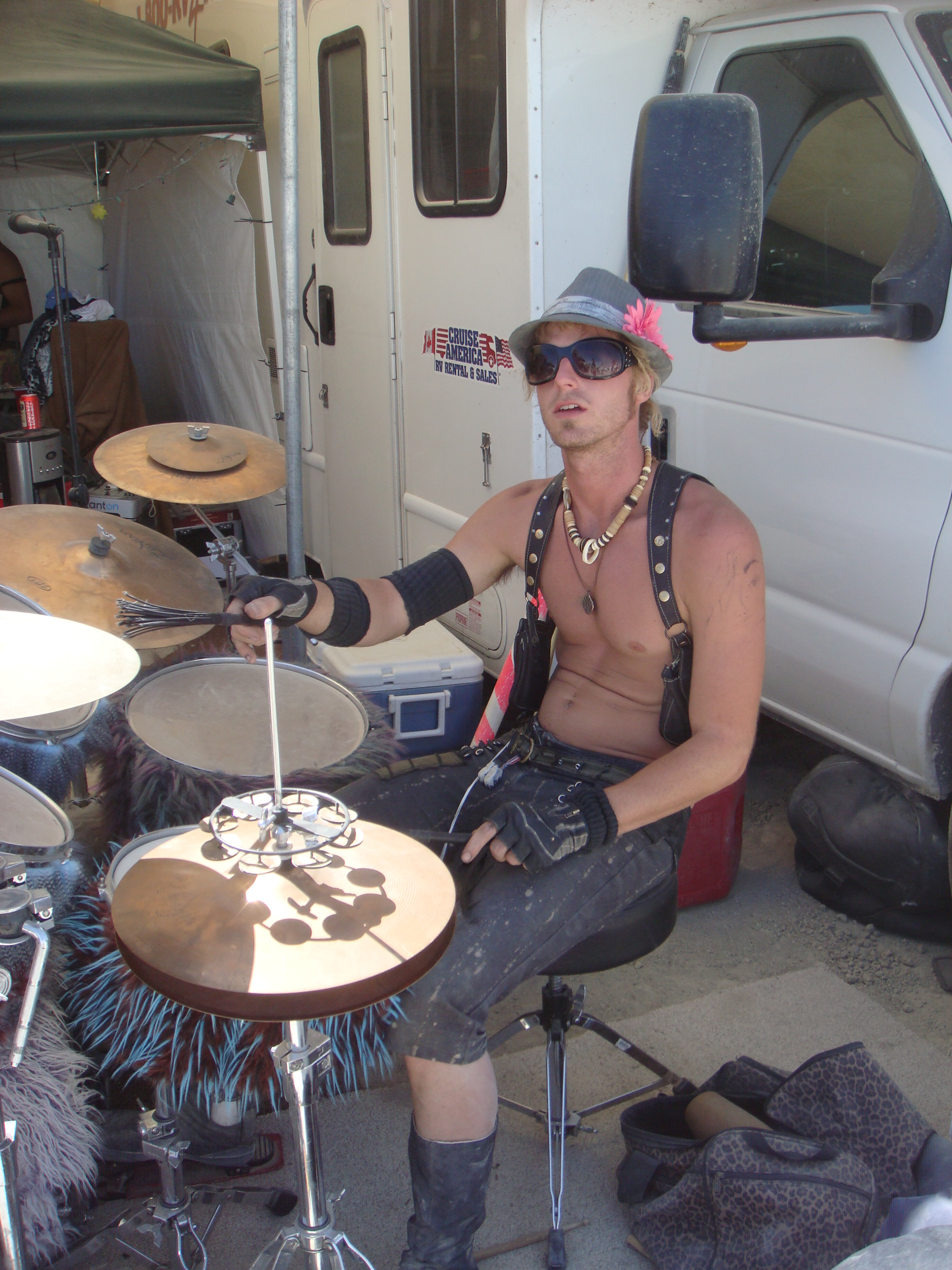 Hans having a go with the drums (I told you the camp was well equipped).