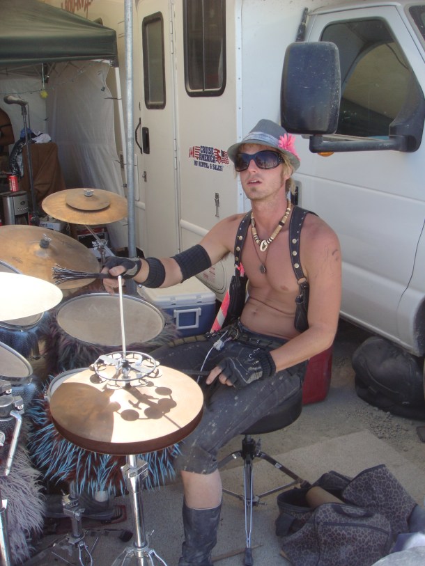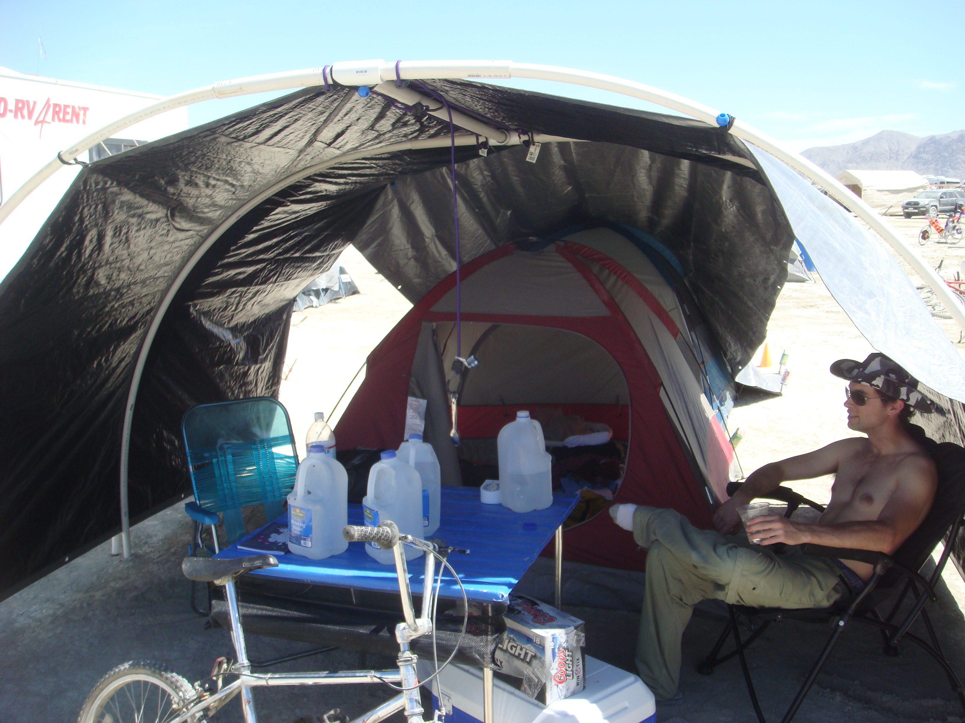 Here’s Ian hanging out in our monkey hut the next morning. The monkey hut was absolutely fantastic by the way and I would highly recommend it to anyone not headed to Burning Man in an RV (and an RV is not really in the spirit of Burning Man, is it?) The monkey hut provides you with the all-important place to hang out in the shade during the day and recuperate from the late night before out on the playa. Sleep and relax during the heat of the day – go out at night when it cools down to tolerable temperatures.