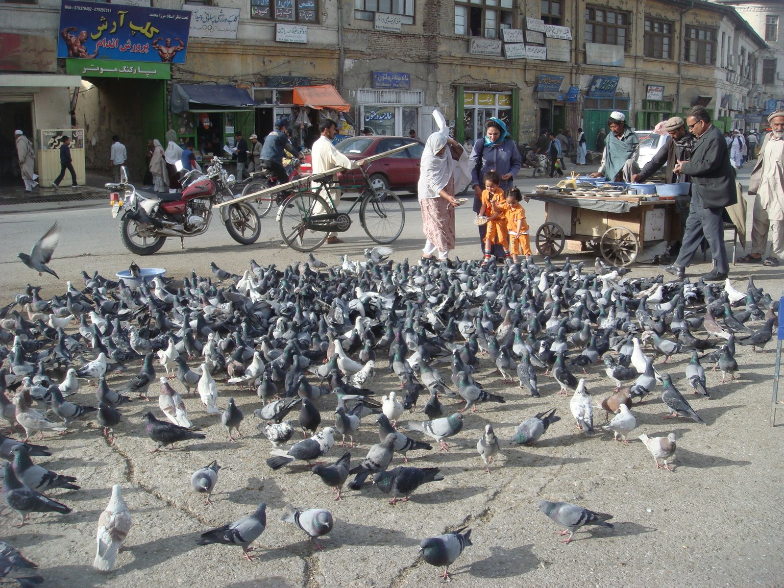 Afghan pigeons. They like to hang out near the cacophonous bird market, where bright-green parakeets and budgies flit by the hundreds inside bamboo cages: