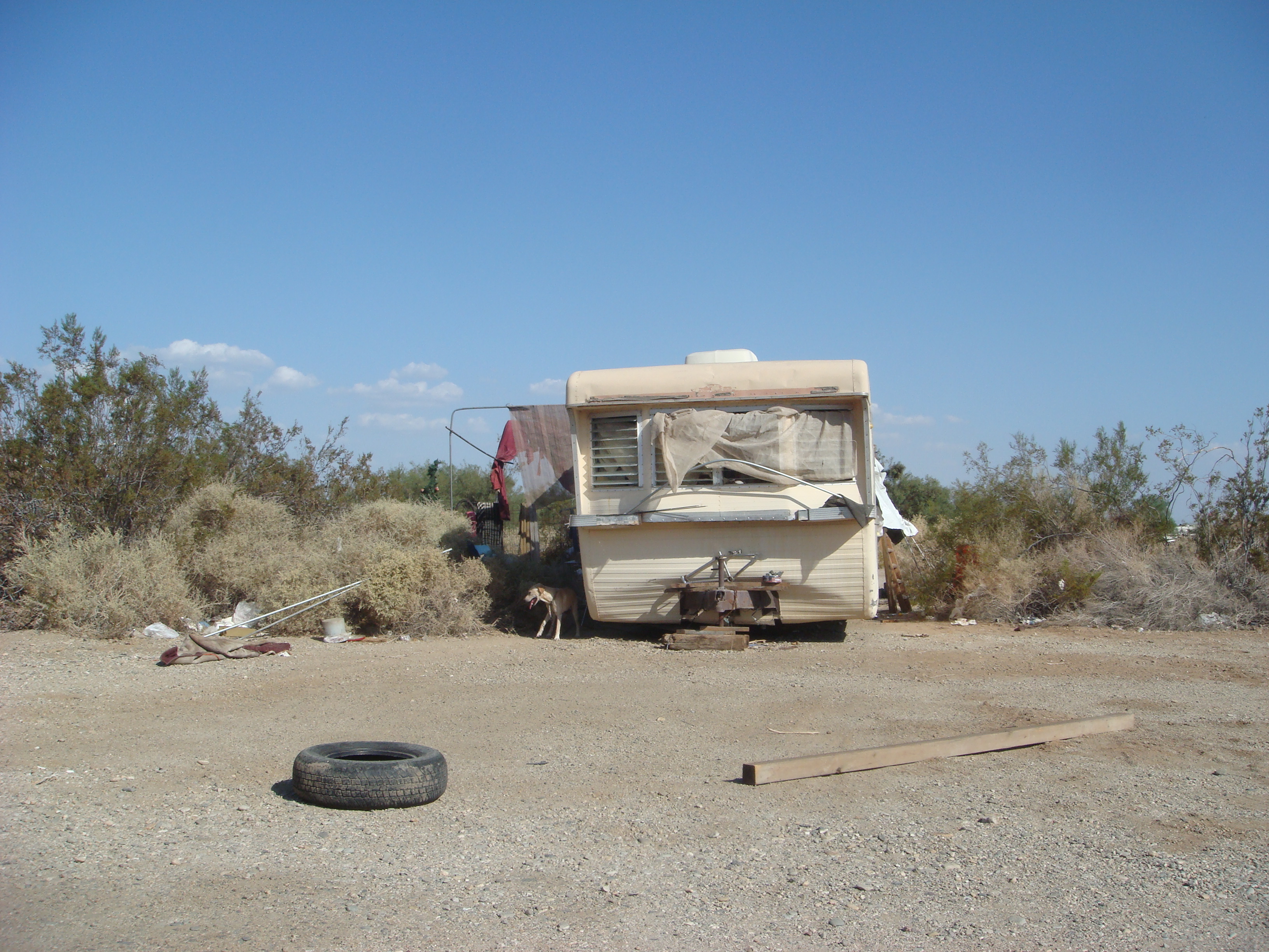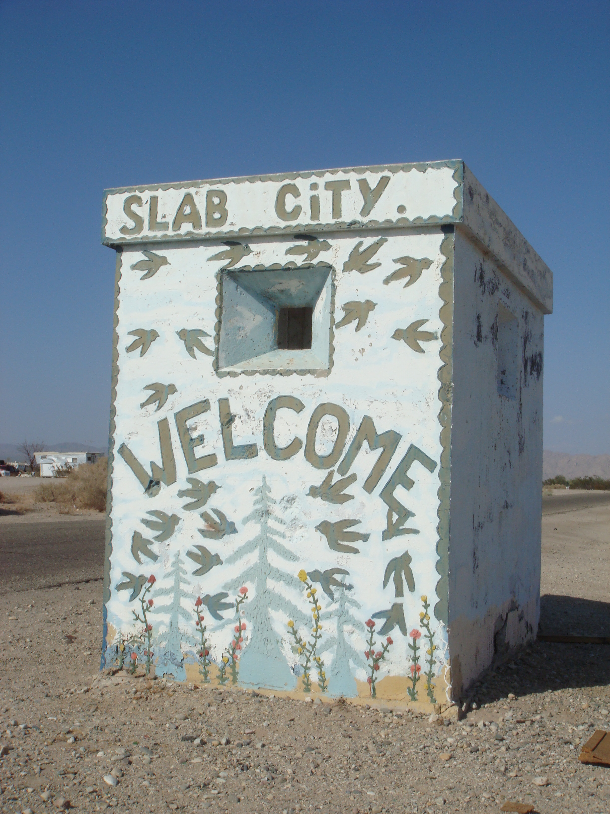 Slab City (or The Slabs) is a camp next to the Salton Sea used by RV owners and squatters from across North America and the world. It takes its name from the concrete slabs and pylons that remain from the abandoned Marine Barracks Camp Dunlap there. Apparently, a group of Marines remained after the base closed, and the place has been inhabited ever since.