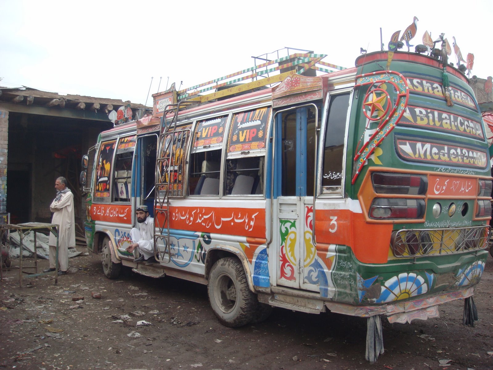The bus fleet of Korea’s Sammi Daewoo Express is the major exception to the bus decorating tradition in Pakistan. The company’s higher ticket prices are intended to appeal to the middle-class market. Painted in corporate colors, the modern Daewoo buses have a comparatively boring appearance, but they are air-conditioned and operate on schedule.