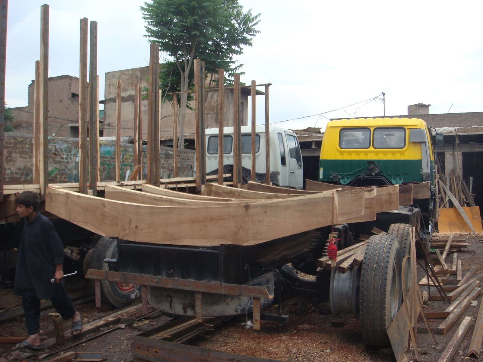 For example: The steel frame supporting the back of the truck is ripped out and replaced with wood. Steel soon develops fractures on the rough Afghan and Pakistani roads, so wood is used instead and proves far more durable.
