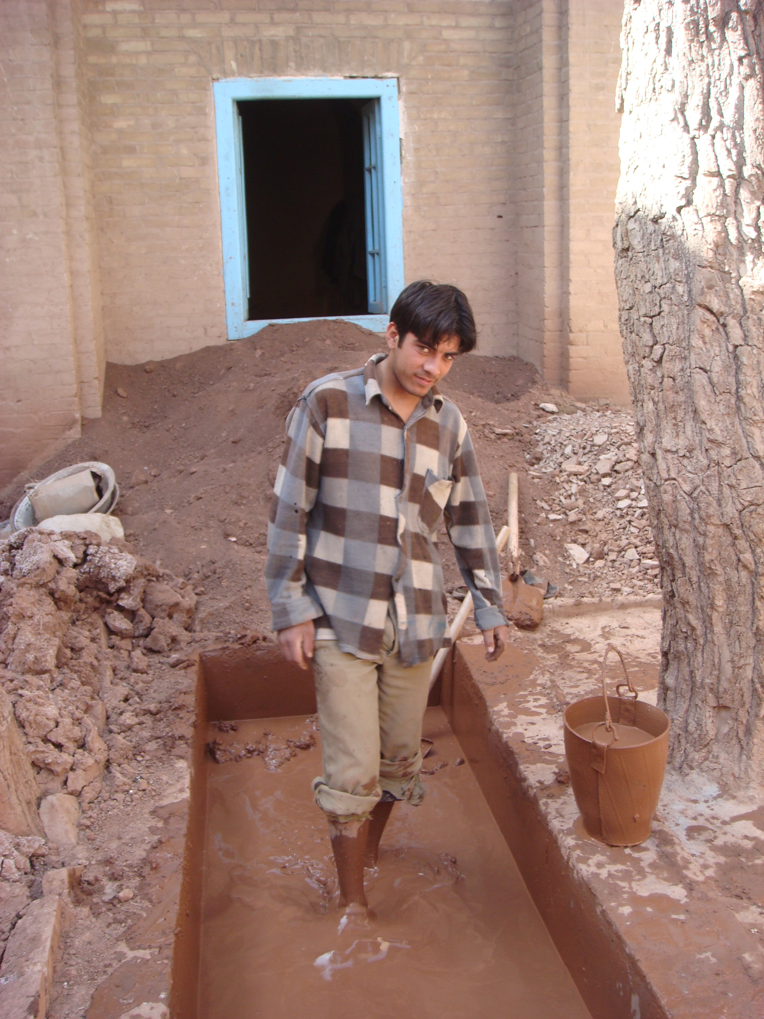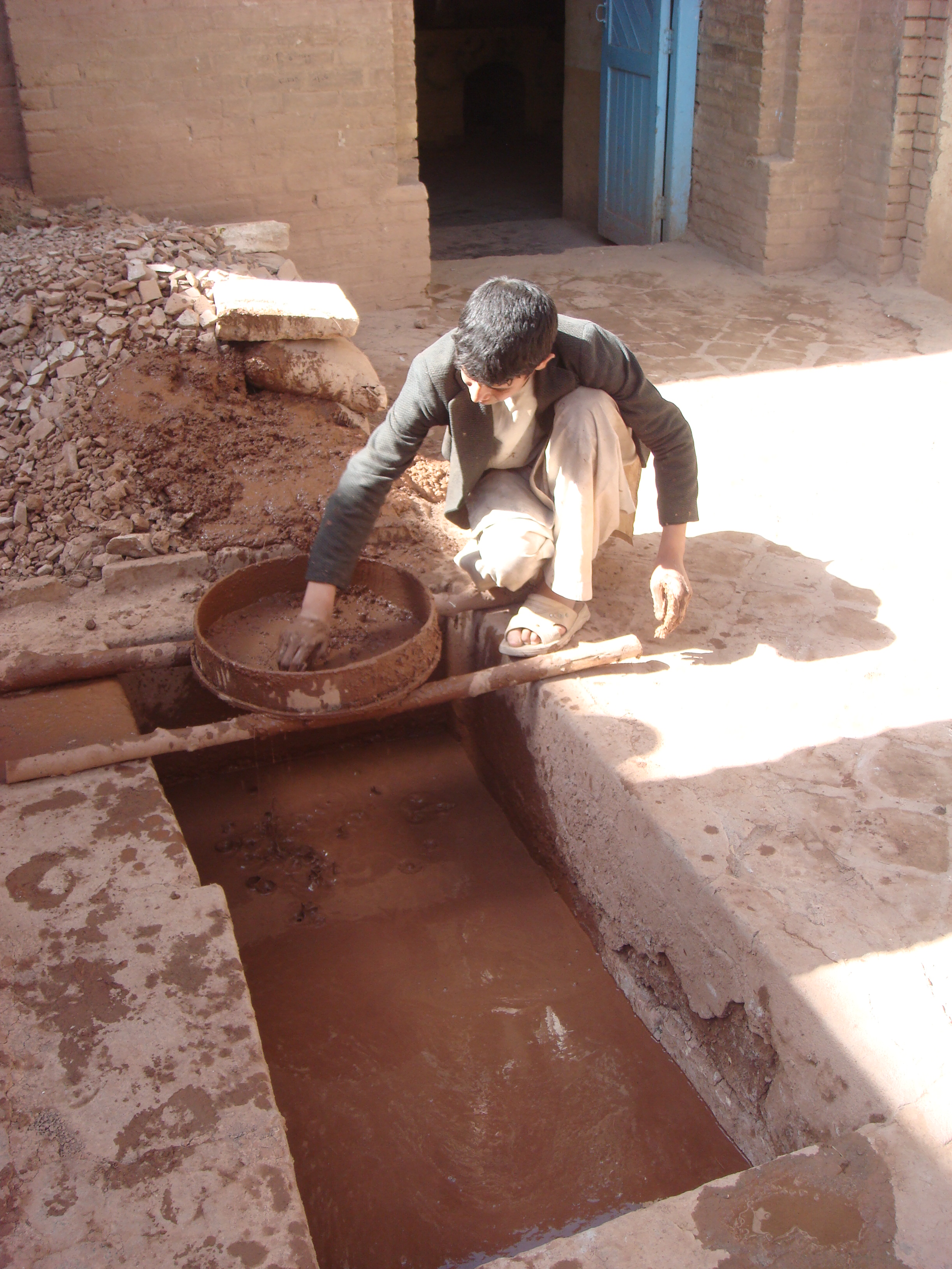 Mixing clay (below) in order to form the tiles: