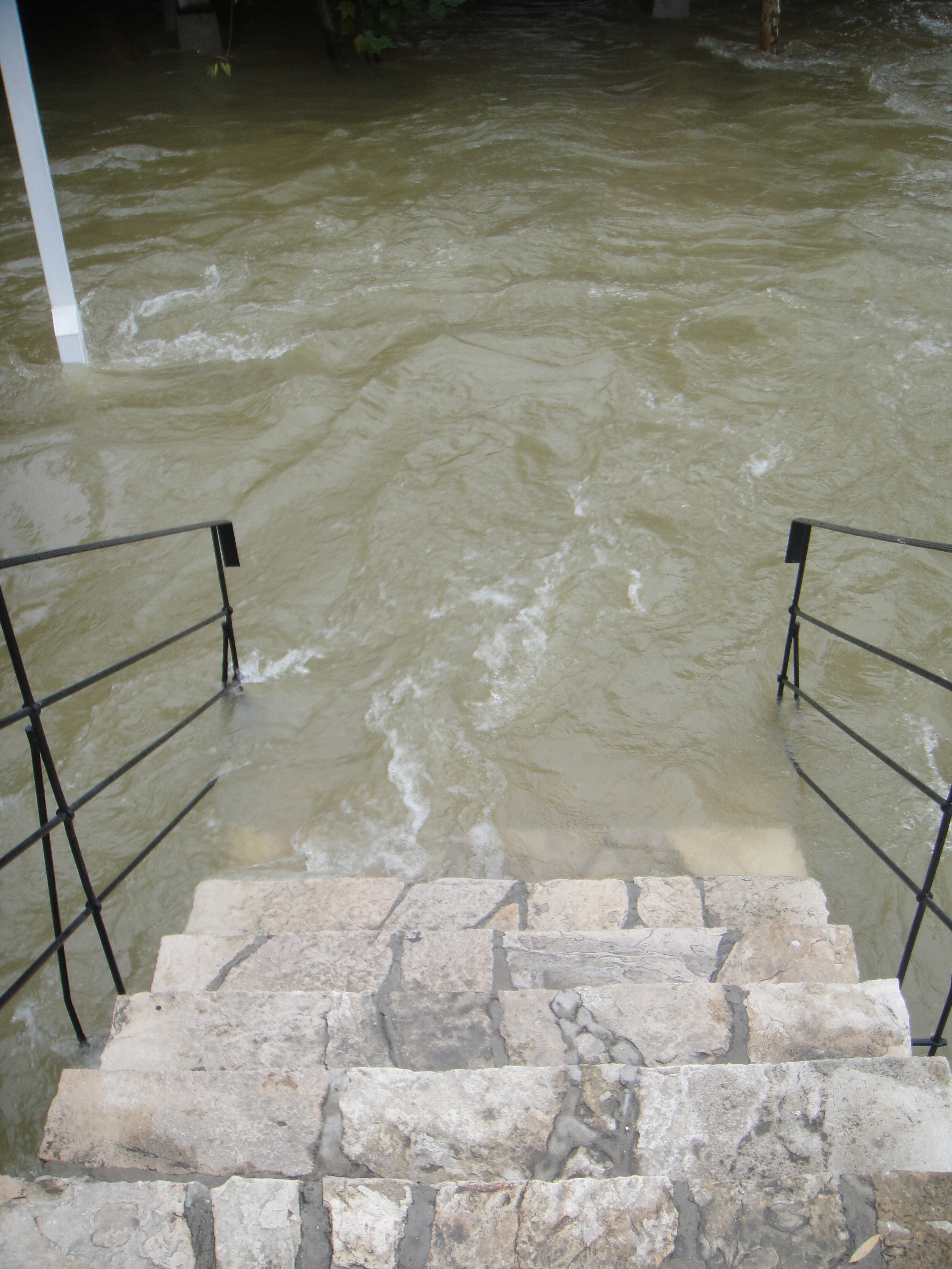 Flooding made all the more interesting by the fact that the river originates in a cave at the base of the cliff:
