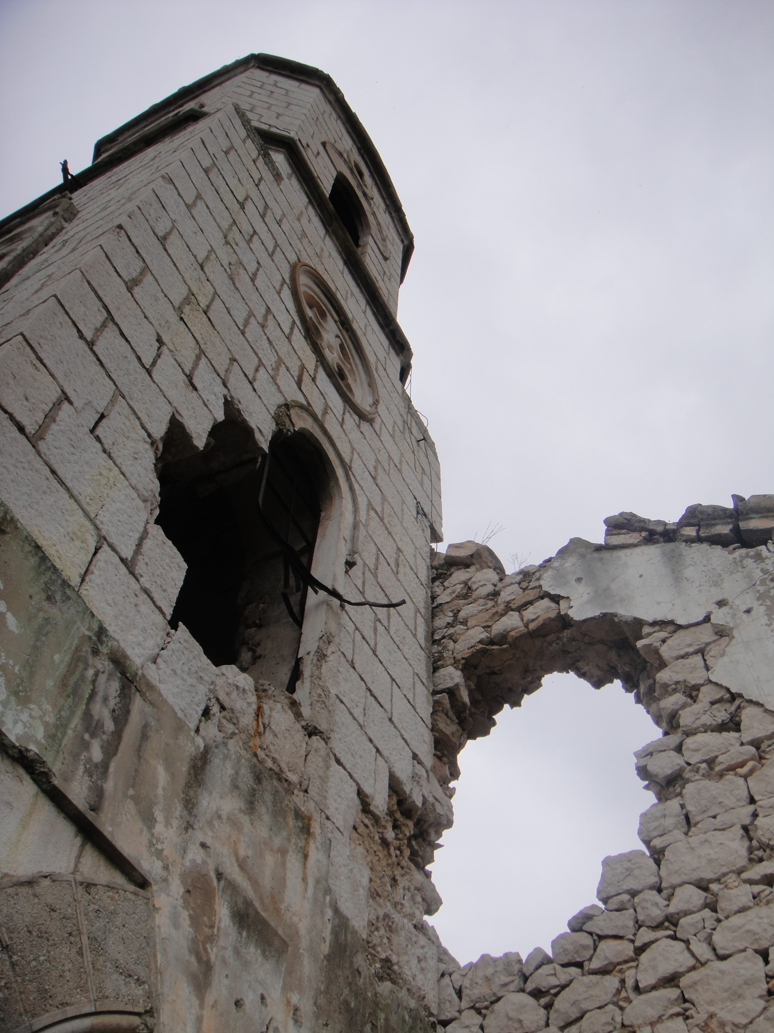 It looks like an anti-tank rocket or artillery smacked into this church tower, so perhaps a sniper was holed up in here: