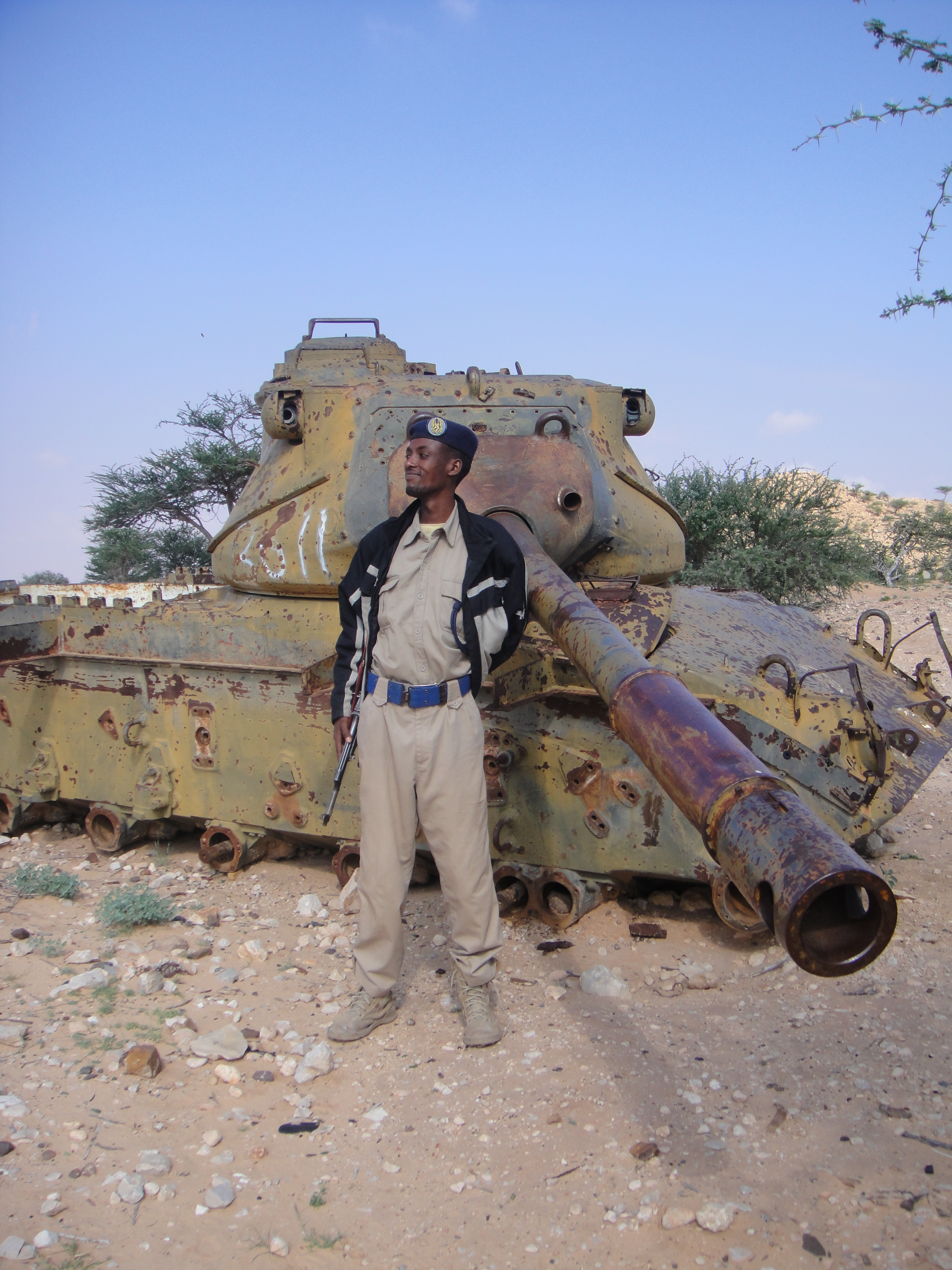 The armed guard we hired, Mahamed Ali, poses next to the bombed-out tank for me: