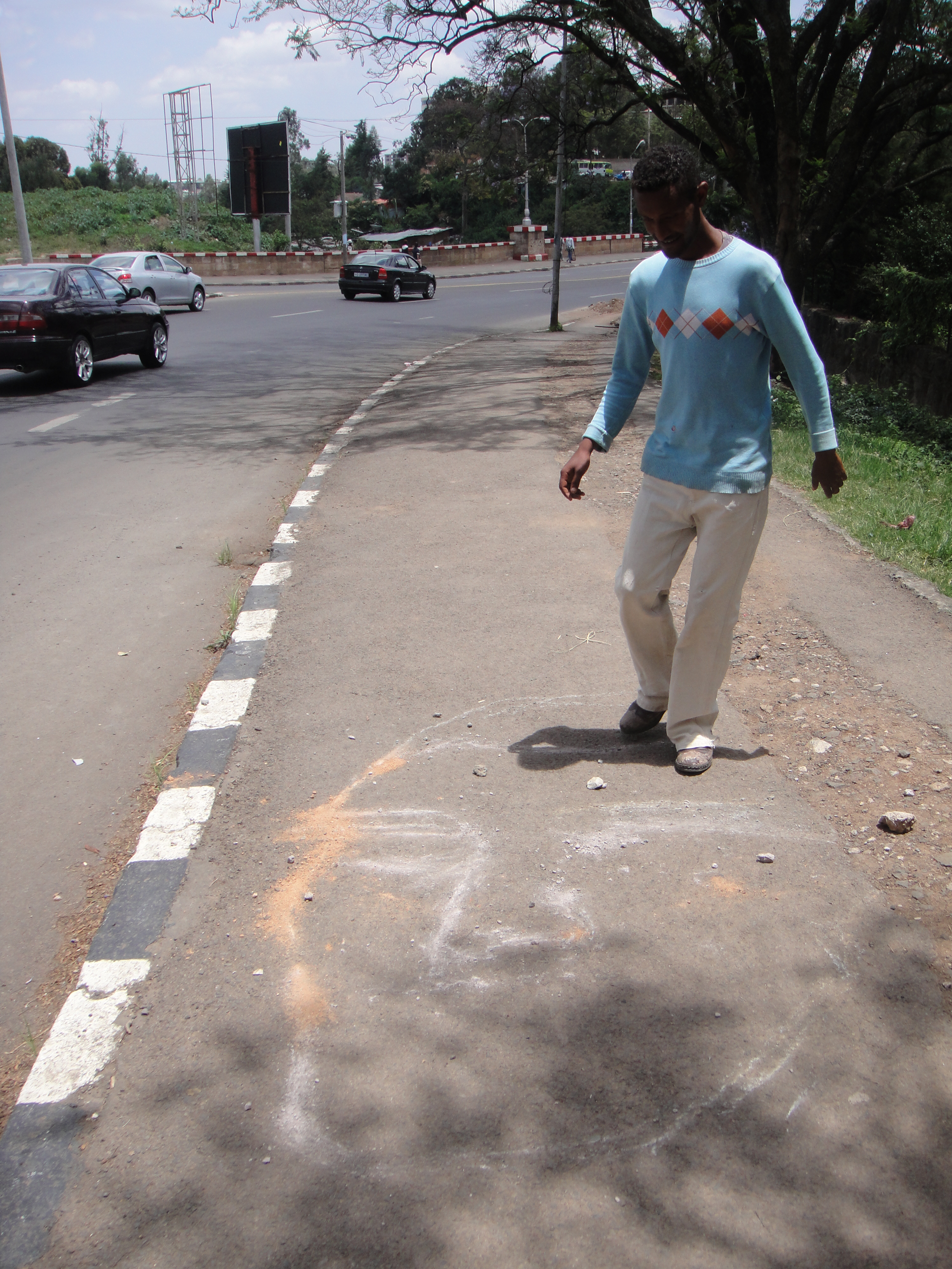 Solomon claimed that he could draw a self-portrait of himself with his hands, feet or mouth on any medium and using any material. Naturally, I was intrigued by this claim and so he offered me a demonstration on the spot. The “spot” happened to be the sidewalk we were standing on and the materials used were bits of rock and mud in the drain next to the sidewalk. Oh, and he confined himself to only using his feet!