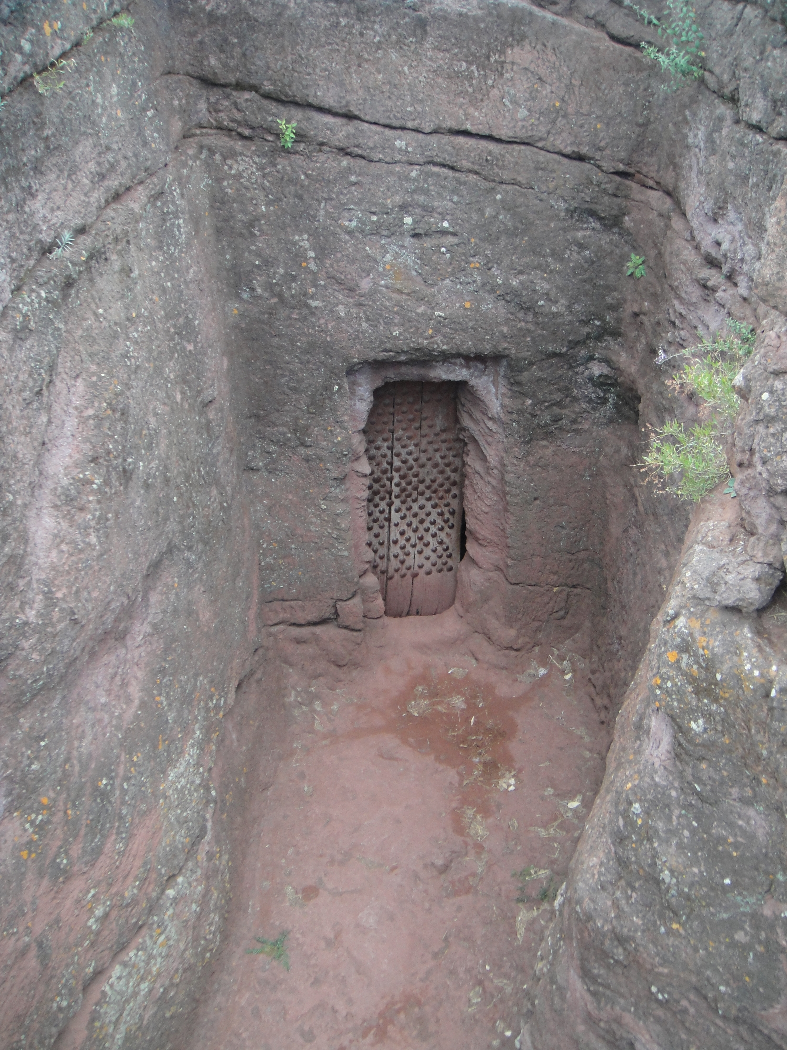 Unlike most Lalibela churches, its entrance is at the top and is accessed by a small walkway, high over the moat-like trench below. This, along with its curious, irregular floor plan, has led scholars to propose that Bet Gabriel-Rufael may have been a fortified palace for Aksumite royalty as early as the 7th and 8th centuries.