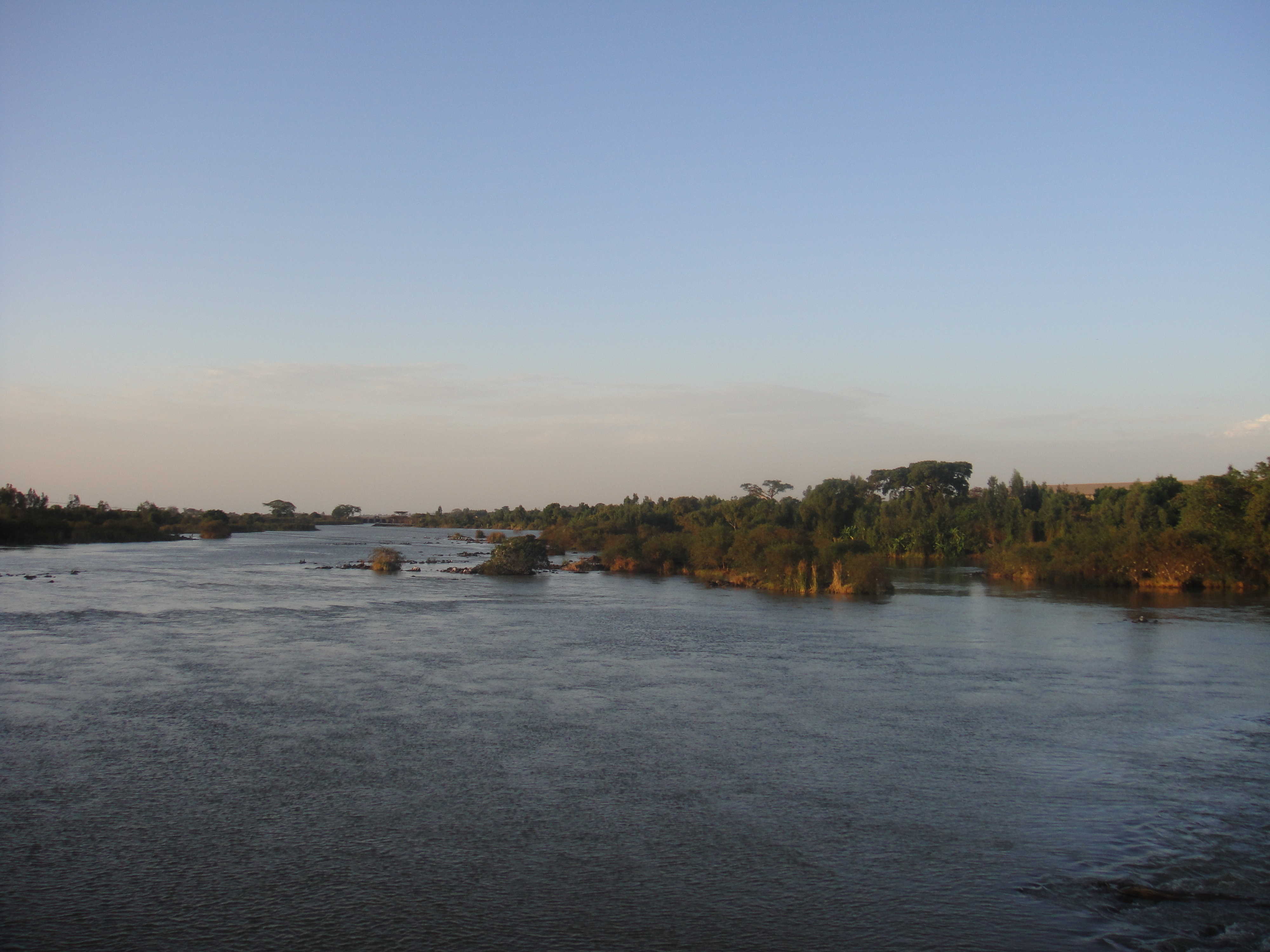 Remember the Blue Nile outlet? This is around the bend (downriver) from that point and is now unambiguously the Nile River instead of Lake Tana. Hard to tell, but that water is teeming with hippos: