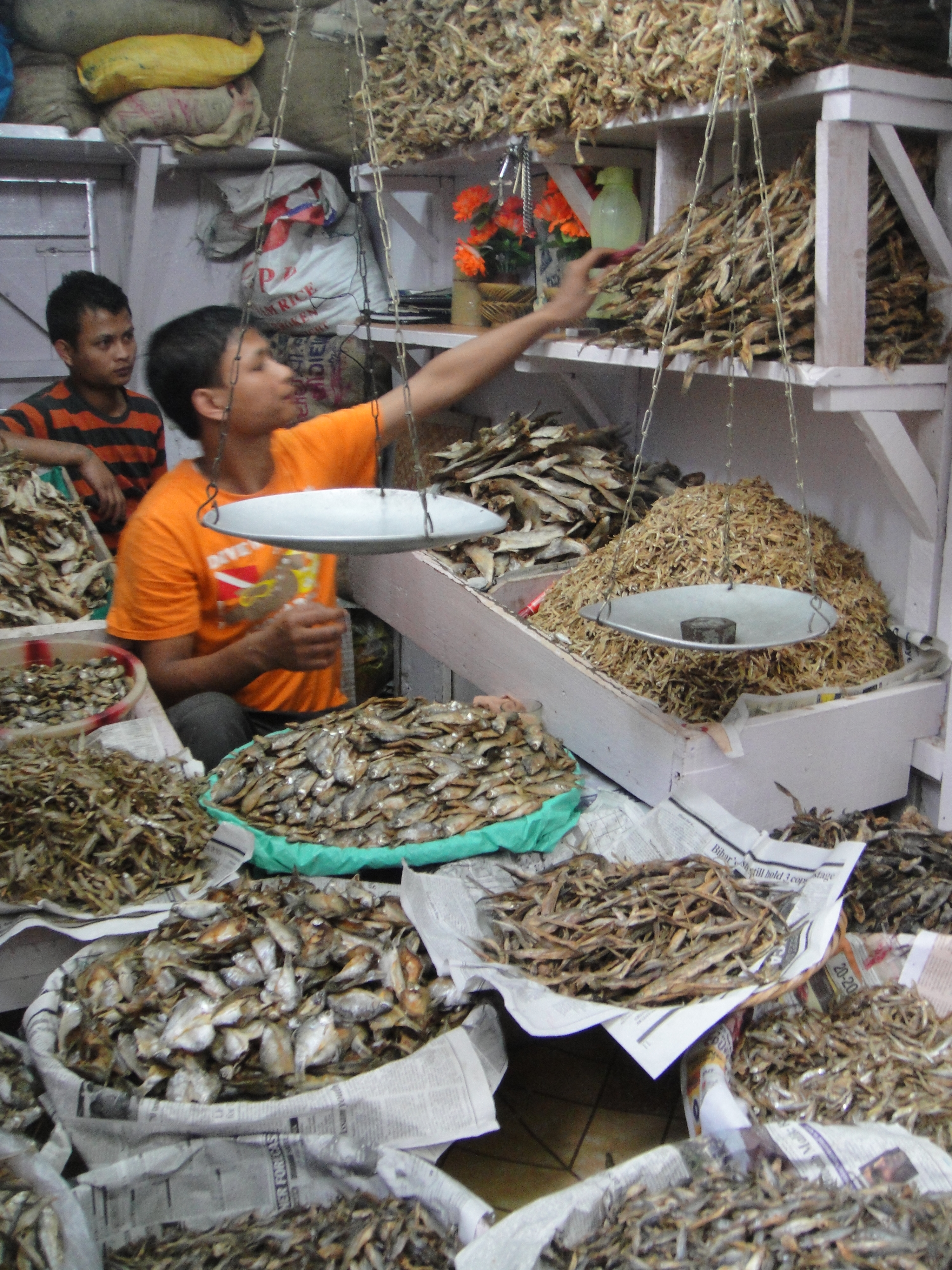 This man’s specialty is dried fish and every basket and pile around him contains a different variety:
