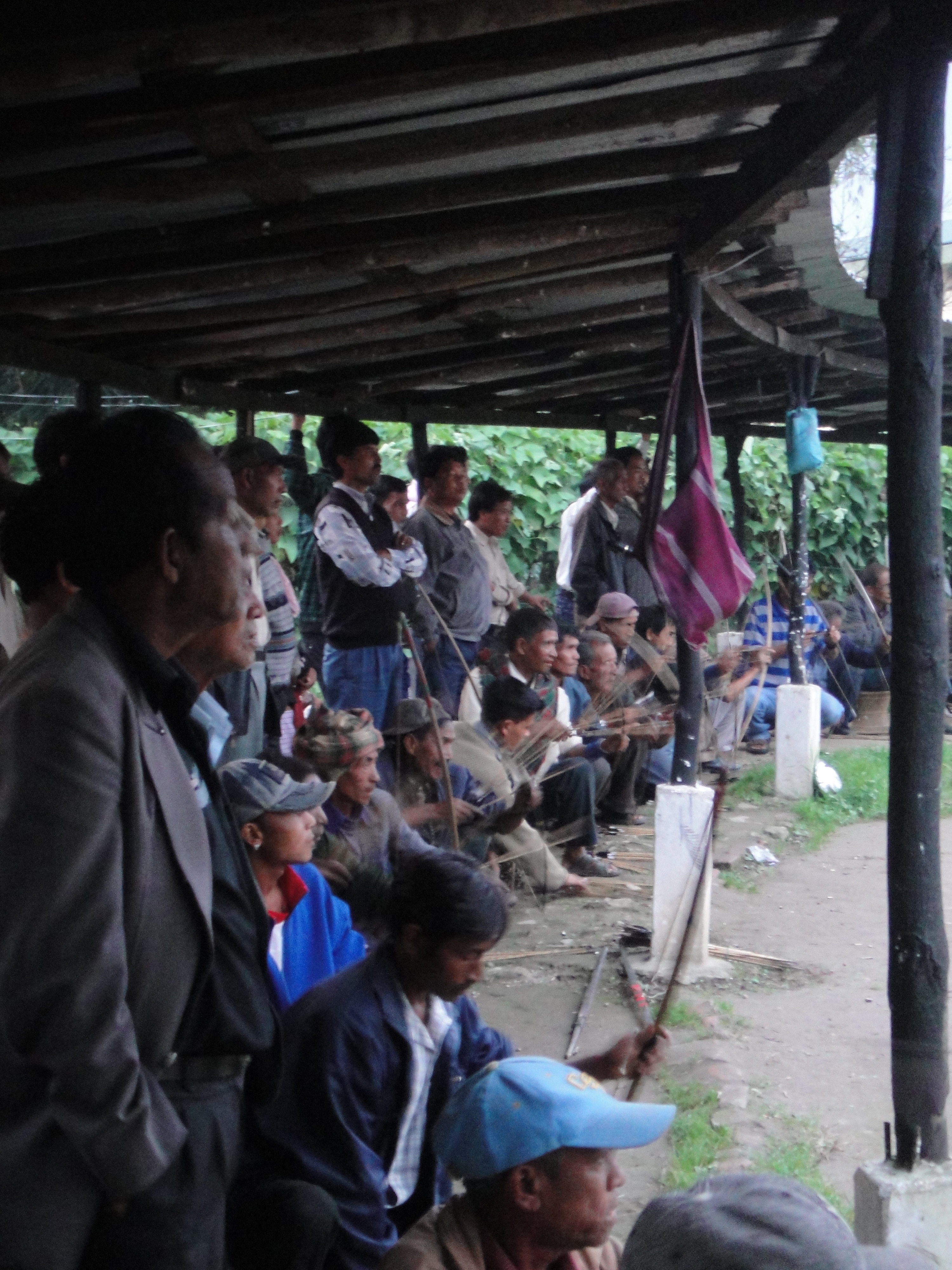 To obtain the random numbers needed for the lottery, a group of Khasi tribesmen squat in a semicircle around a straw target and fire as many arrows as possible into it over a set time before a canvas curtain is raised to keep further arrows off the target. The arrows stuck in the target are then counted and the last two digits of the number of arrows embedded in the target are used. So, for example, 701 would equal 1 or 938 would equal 38.
