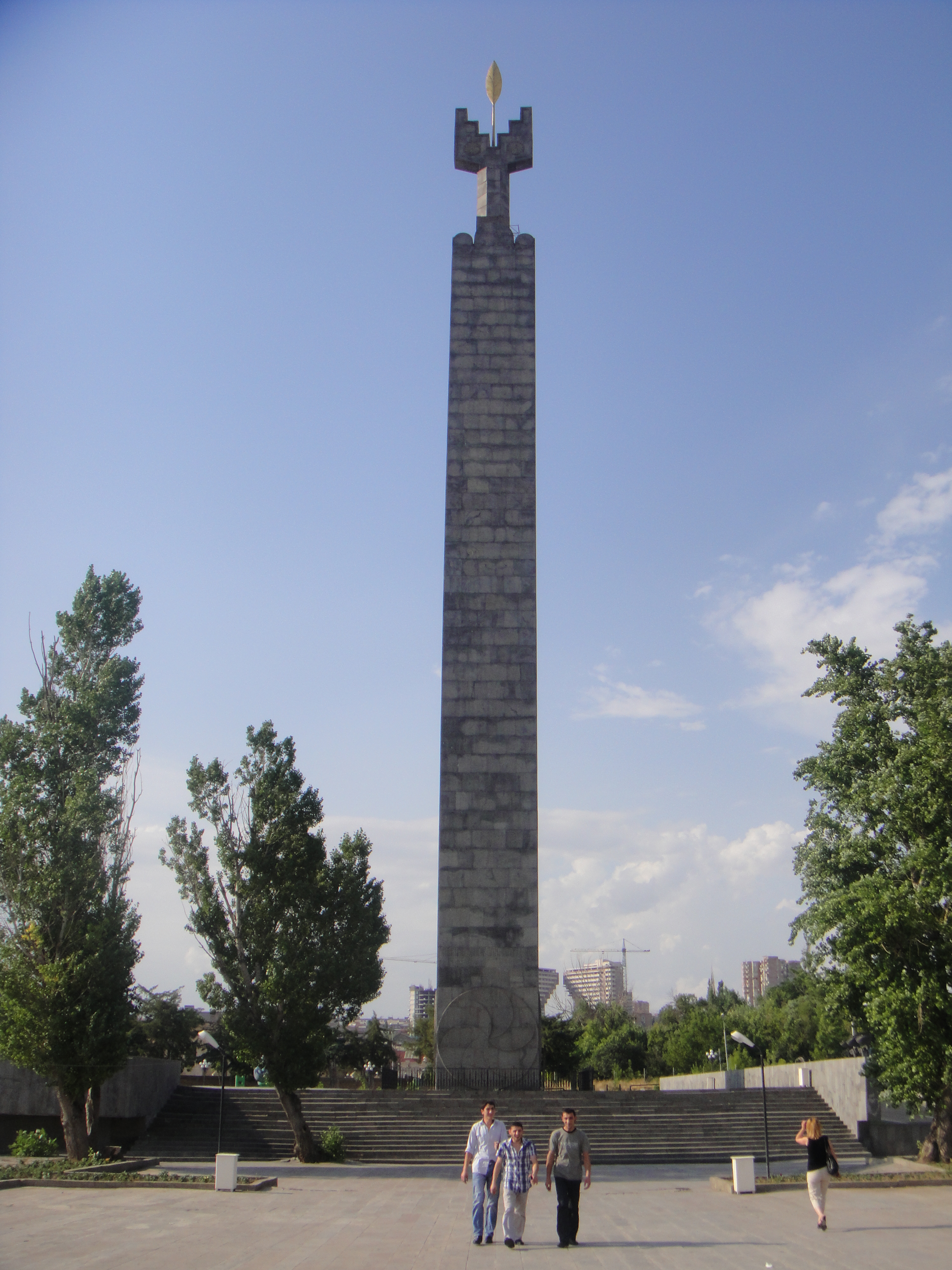 The stele reaching to the sky symbolizes the “survival and spiritual strength” of the Armenian people. The deep cleft that runs the length of the stele is intended to symbolize the separation of the peoples of western and eastern Armenia while at the same time emphasizing the unity of all Armenian people. To the left of the stele is a ring of 12 large inward-leaning basalt slabs representing the 12 lost provinces of western Armenia.