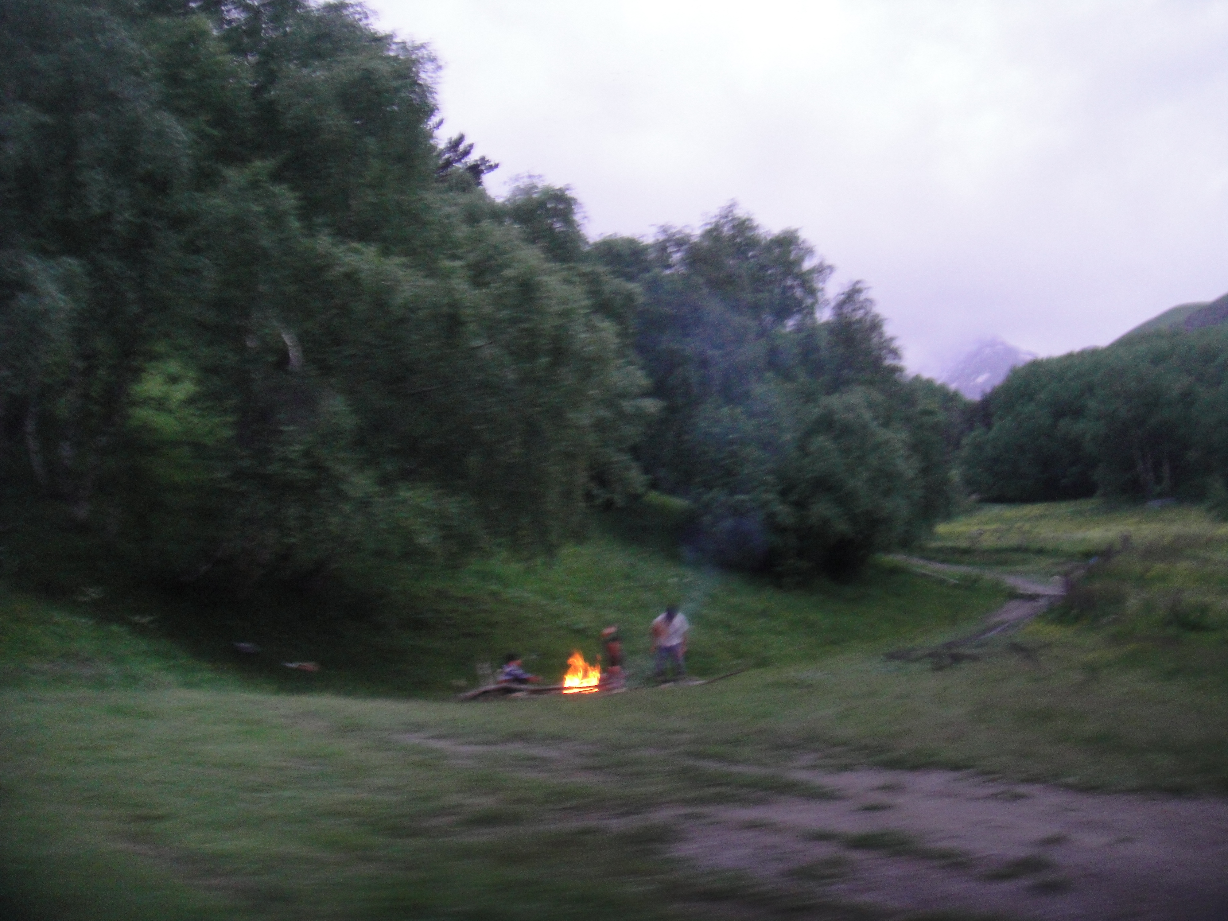 On the way up, we volunteered to give a couple of Georgians a ride to the top with us. They had driven all the way out from Tbilisi and had wanted to hike up to the church. However, it was getting too late for them to be able to make it, so we made their day by giving them a ride. They had been hanging out around this campfire with some other Georgians they met on the hike up: