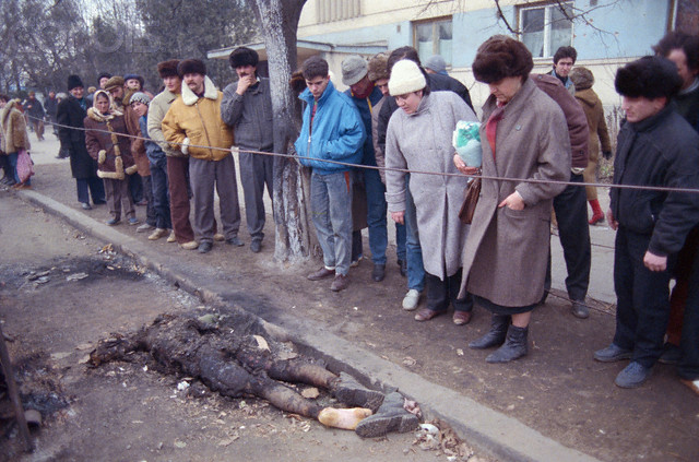 Romanians examine the burned body of a Securitate agent: