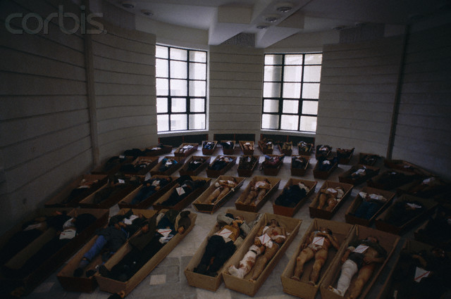 Corpses of victims of the fighting lying on the floor of the Forensic Institute in Bucharest, which served as a morgue during the December 1989 Romanian Revolution: