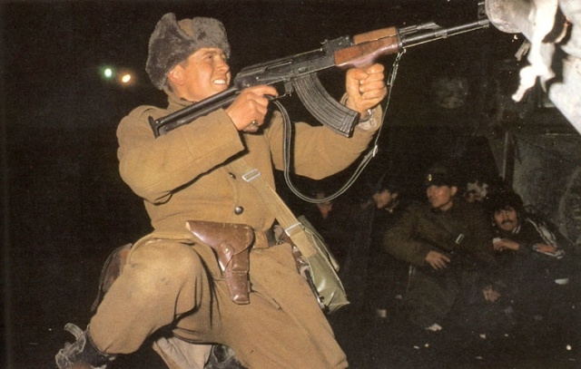 A civilian fighter armed with an AK-47 chases Securitate agents still loyal to Ceausescu: