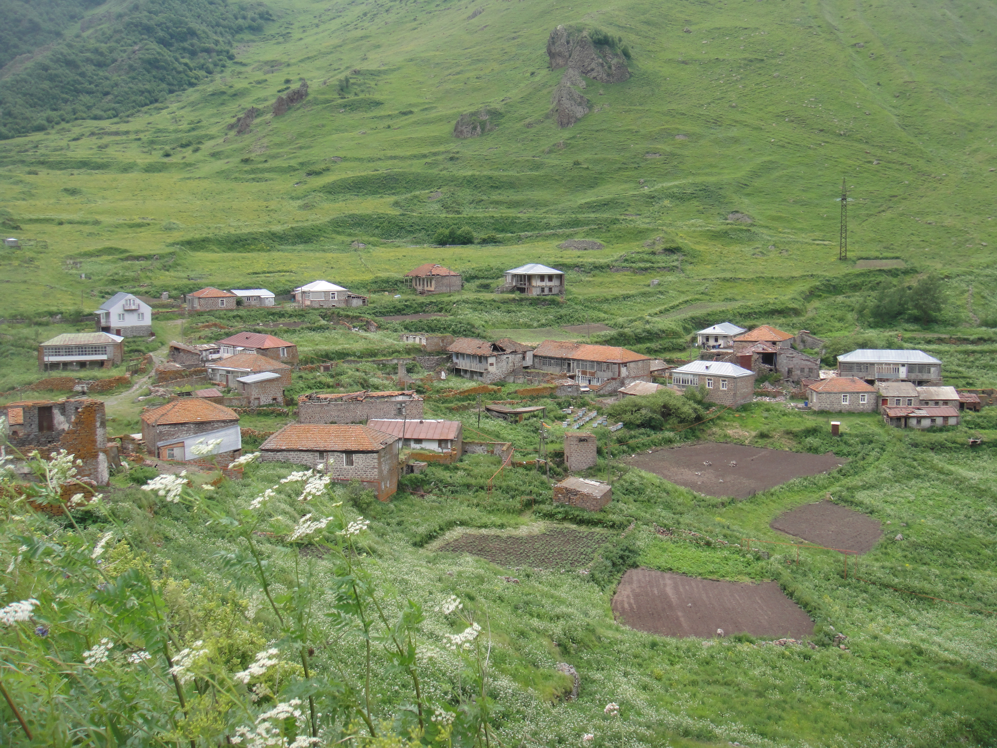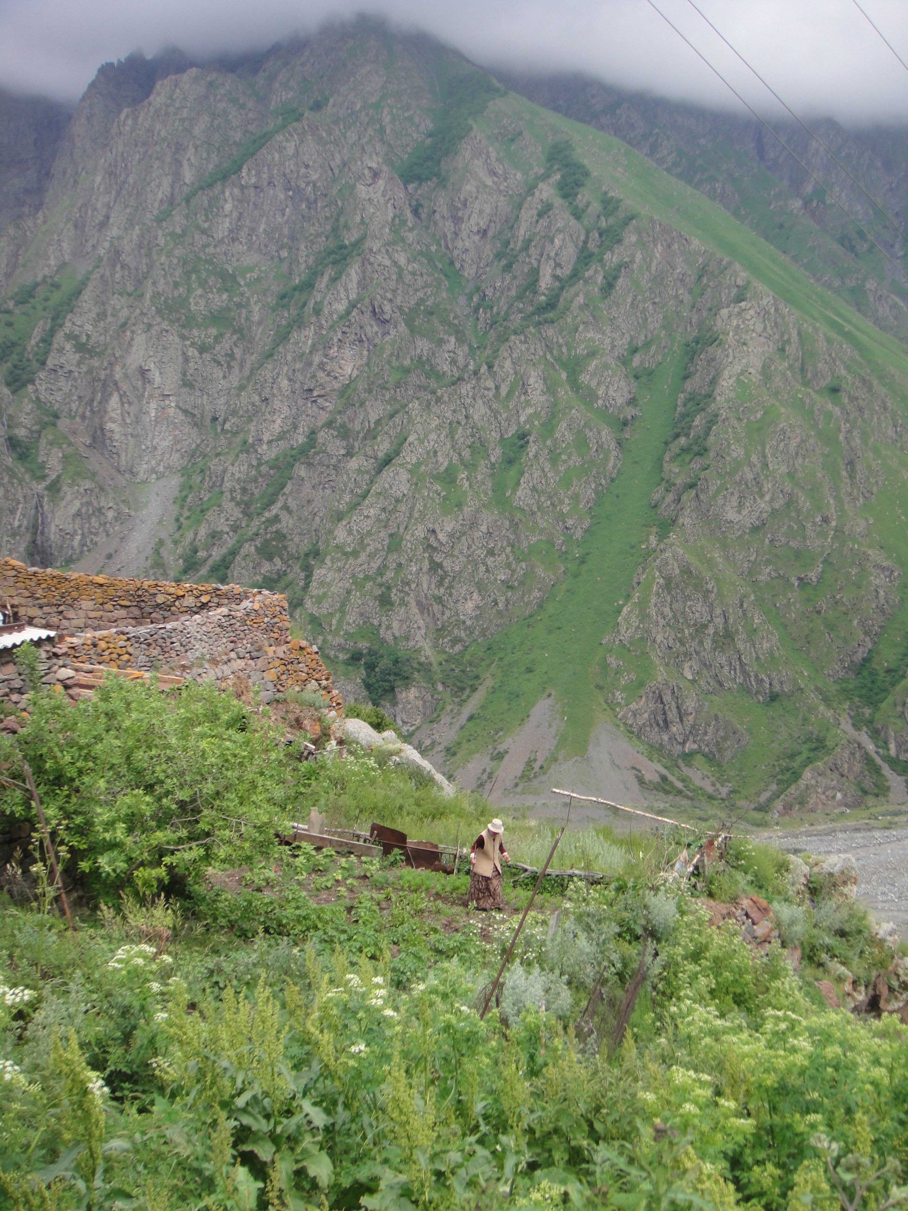 The villagers grow vegetables for themselves in small plots such as the one in the foreground… In the background is the border with Chechnya: