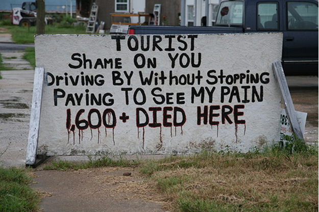 “Imagine having lost loved ones and seen your house nearly destroyed. After a year out of town, you’re in your nastiest clothes mucking sludge out of your bottom floor, fearful that the money will run out before you can get your house, the house that your grandmother bought and passed down to you through your mother, put back together. Imagine that — as you push a wheelbarrow out into the sunlight, blink as you adjust to the brightness, and push your hair off your forehead, leaving a smudge of mud — a bus full of cameras flash at you, taking photographs of your trauma, effort, and fear. And then they take that photo back to their cozy, dry home and show it to their friends, who ooh and aah about how cool it was that they got to see the aftermath of the flood.