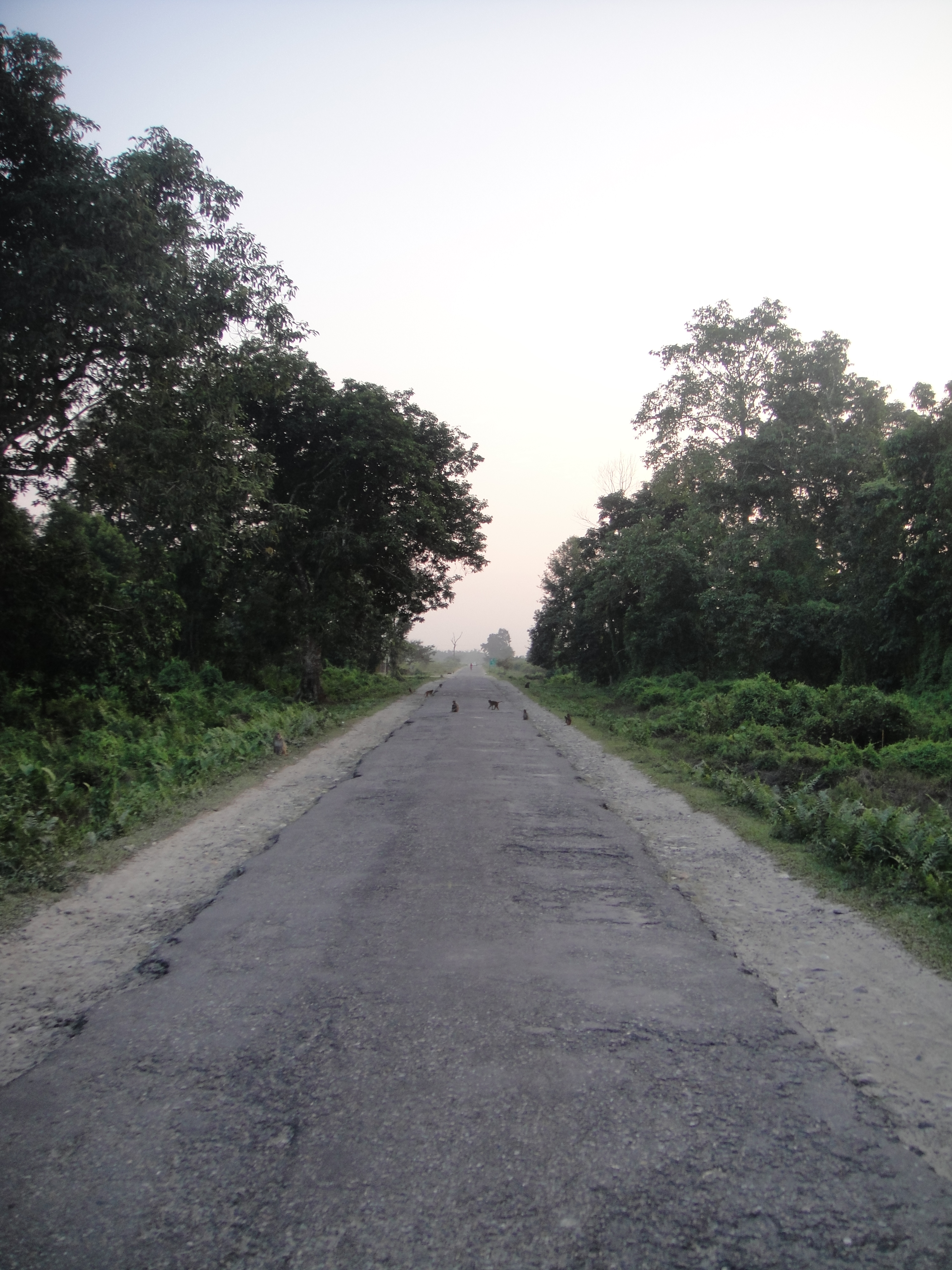 Those dark shapes in the road are monkeys: