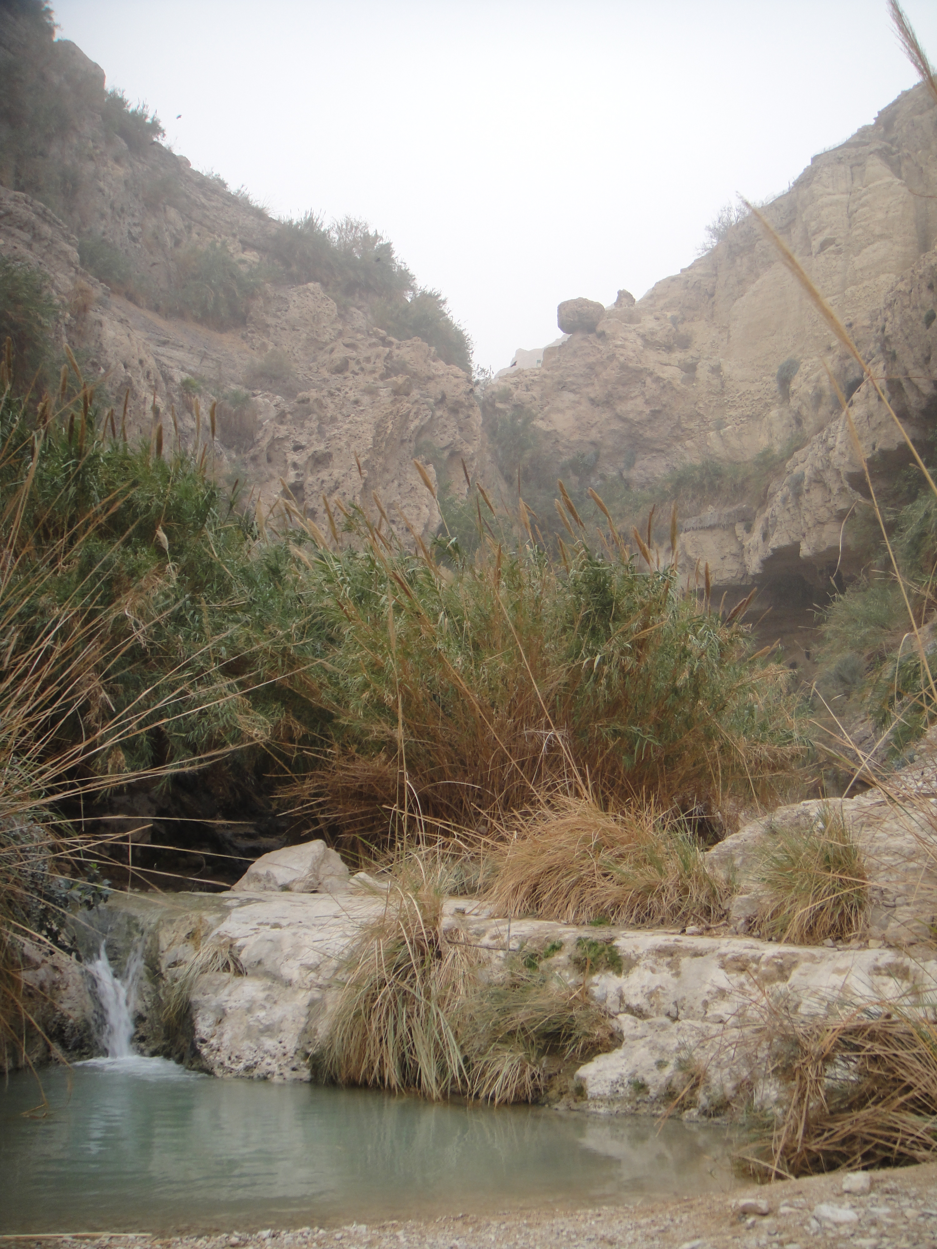 Ein Gedi is fed by several springs which flow through two canyons, Wadi David and Wadi Arugot. The springs are, in turn, fed by rain that falls in the Judaean Mountains which, after having been absorbed into the water table, flows underground towards Ein Gedi where it emerges as you will see below.