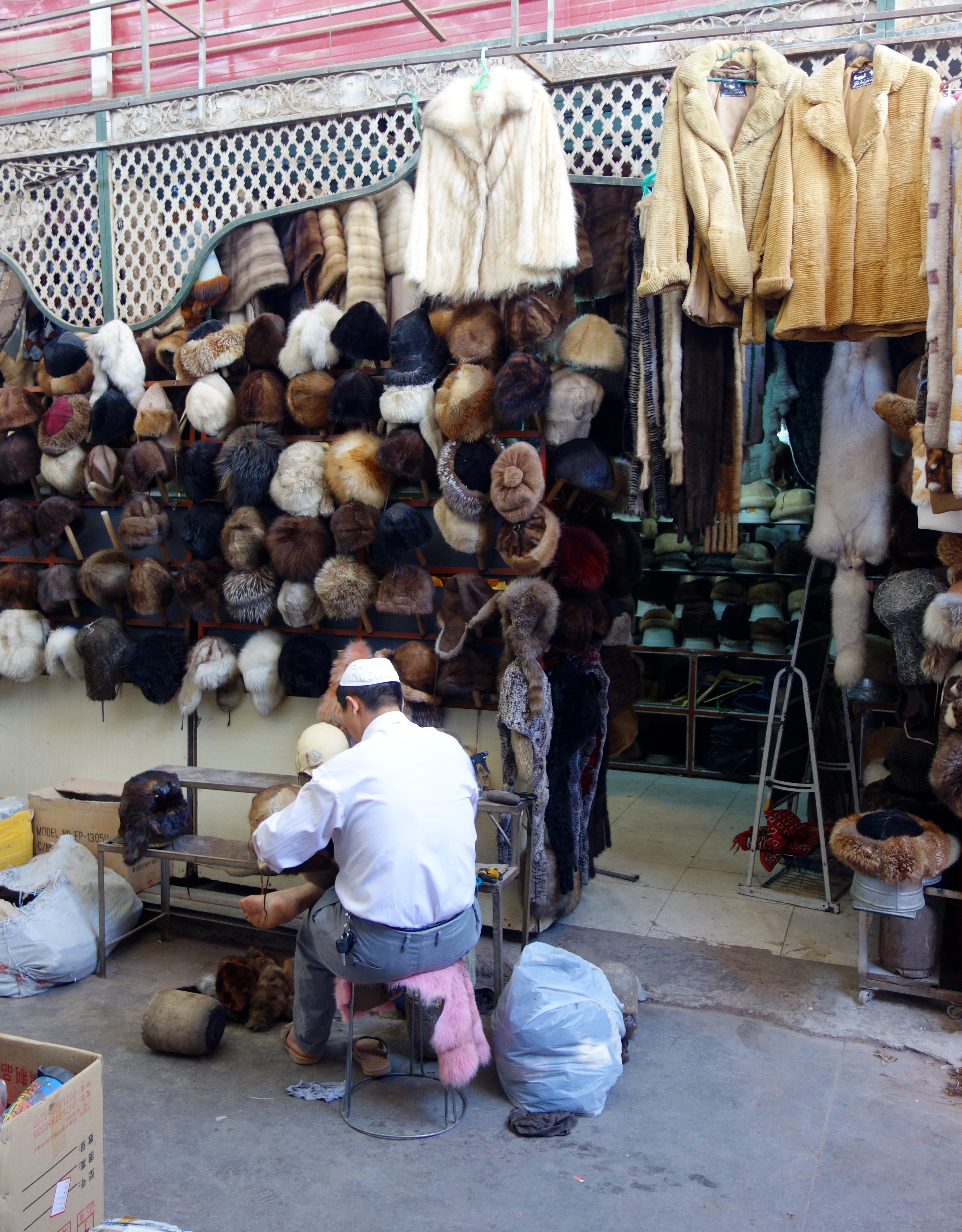 A furrier at work in another section of the market specializing in furs: