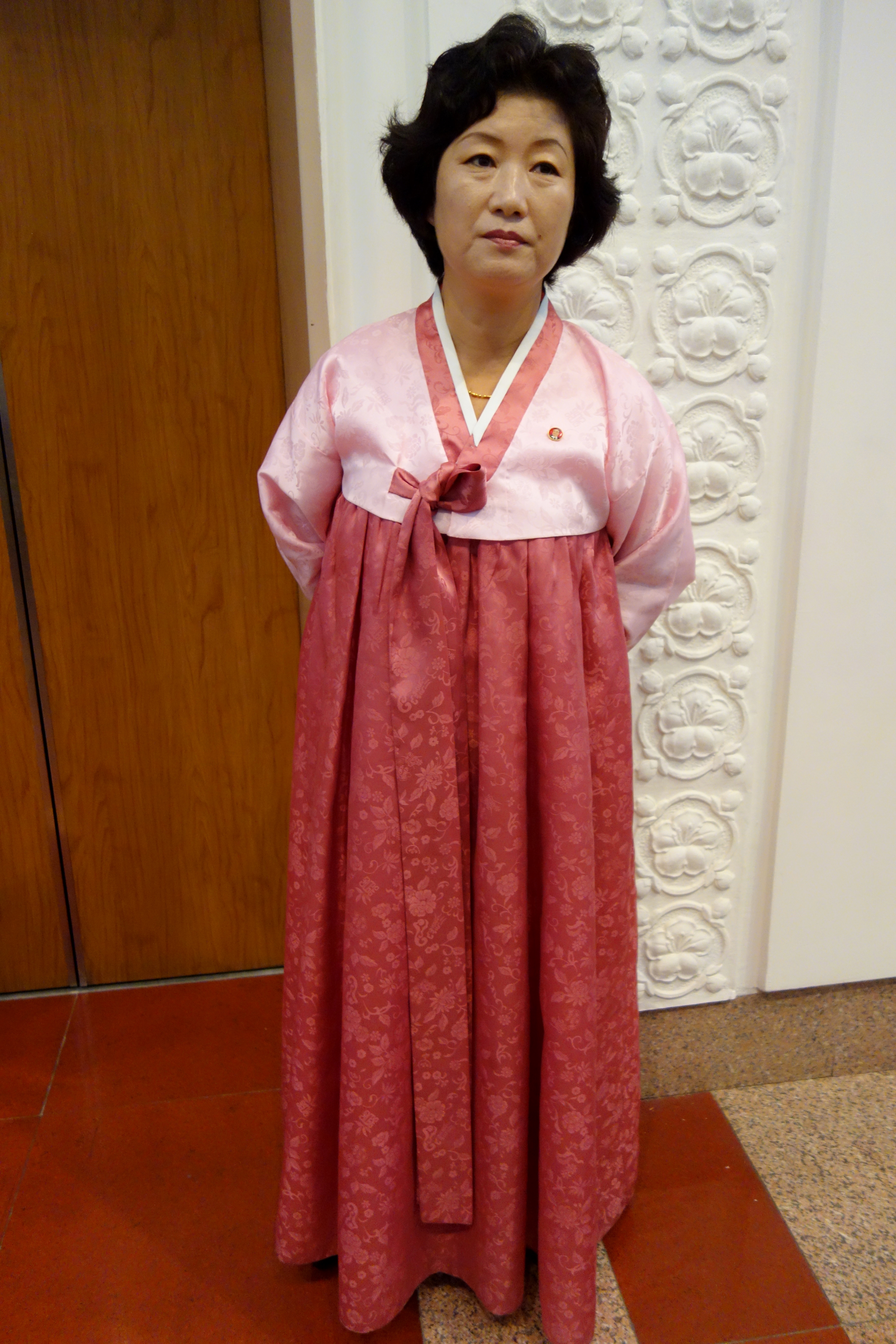 This is a picture of the tower from the other side, which is where the entrance is, with our favorite North Korean minder – Kim – serving to provide scale: