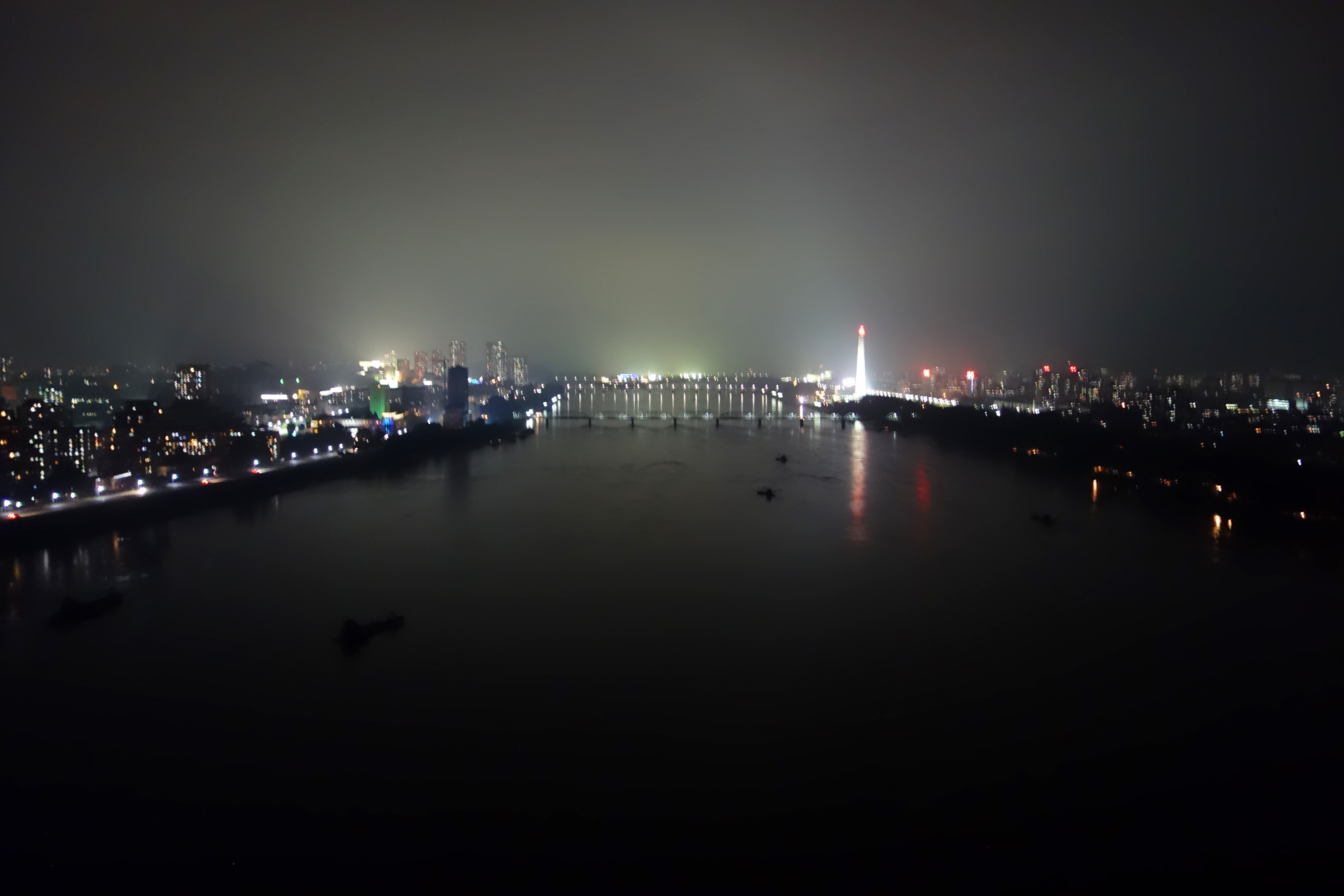 A view of the Juche Tower across the Taedong River from Kim-Il-sung Square: