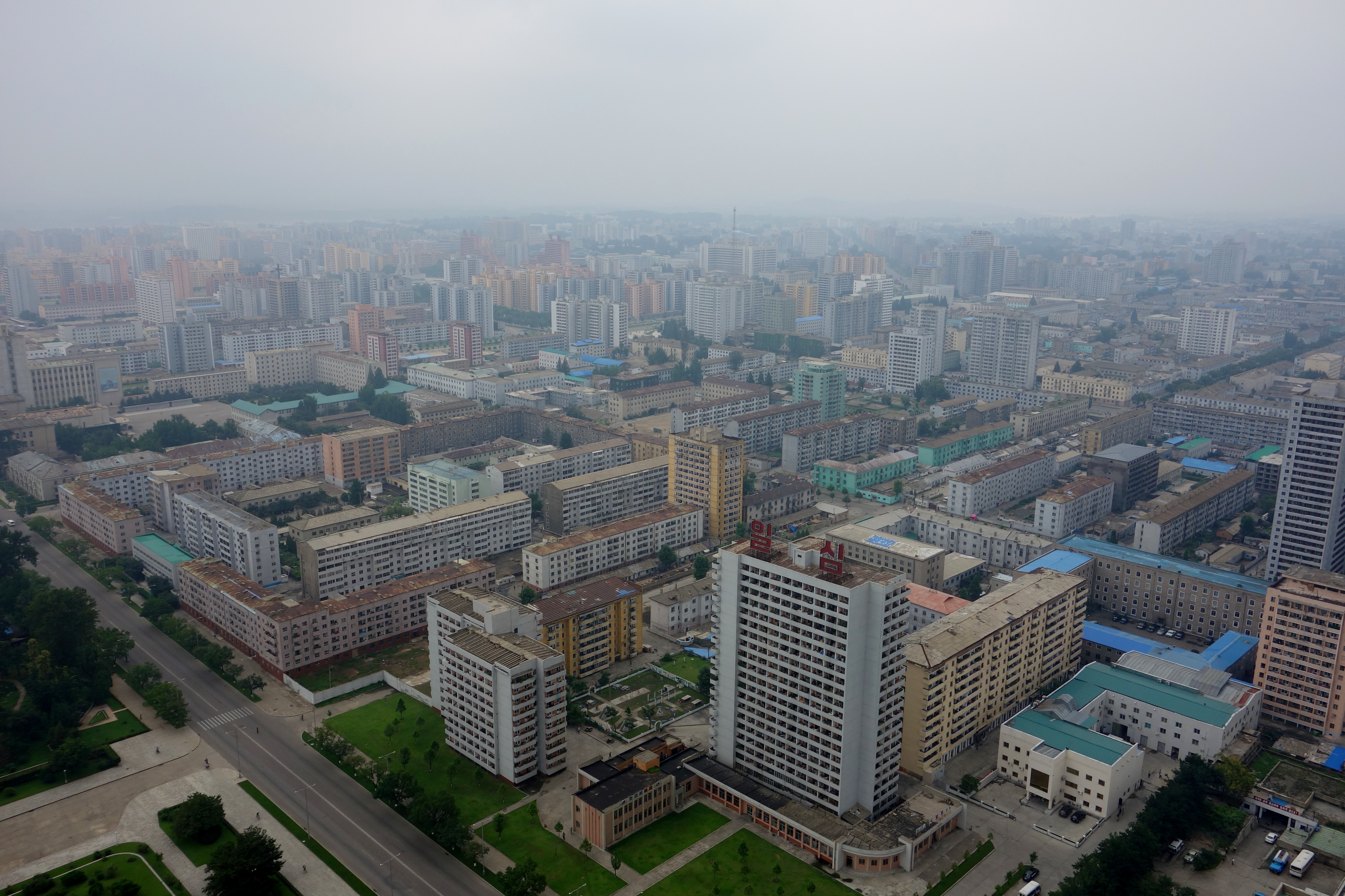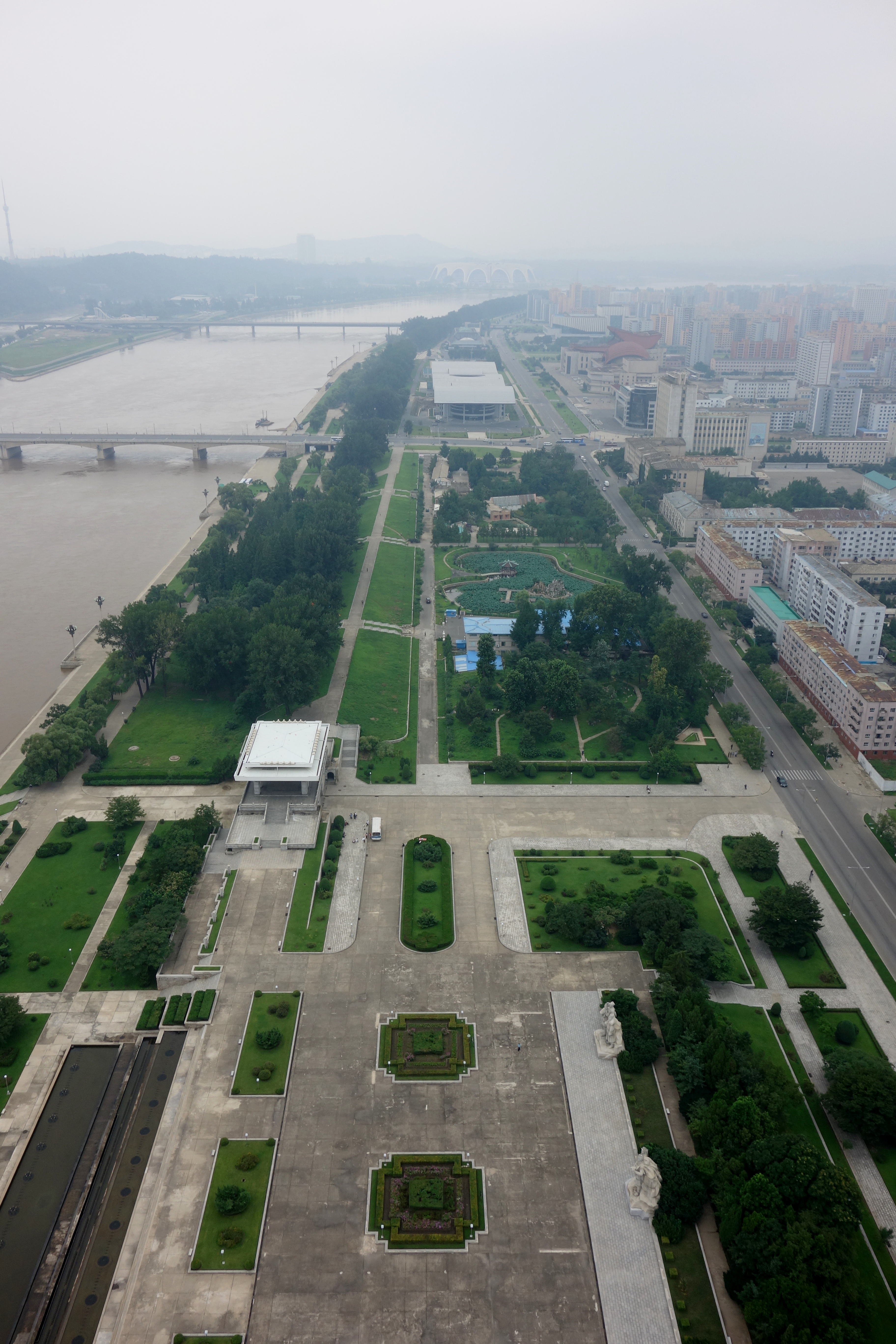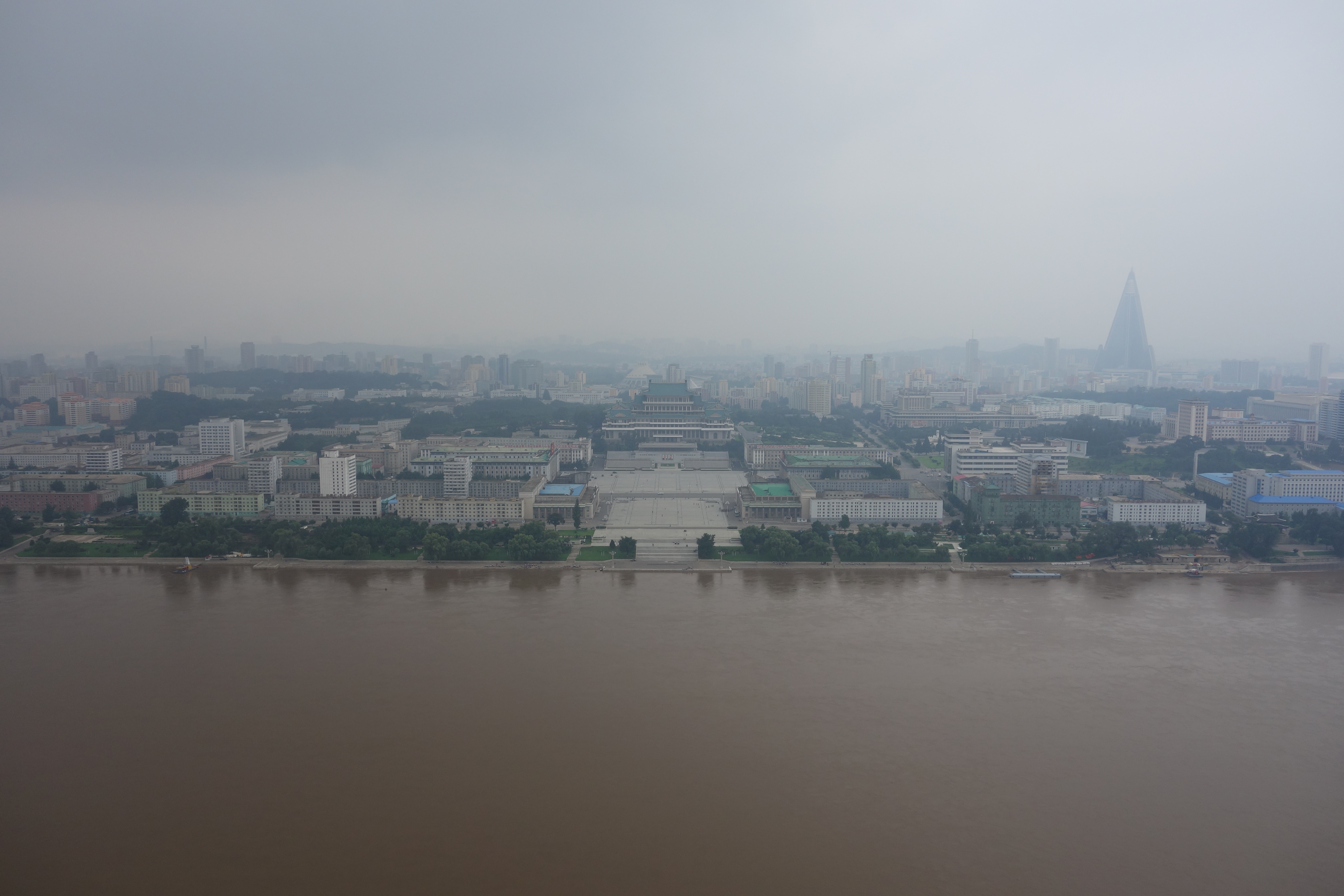 The view out toward the western side of Pyongyang with Kim-Il-sung Square and the Grand People’s Study House in the center of the picture and the infamous “Hotel of Doom” off to the right:
