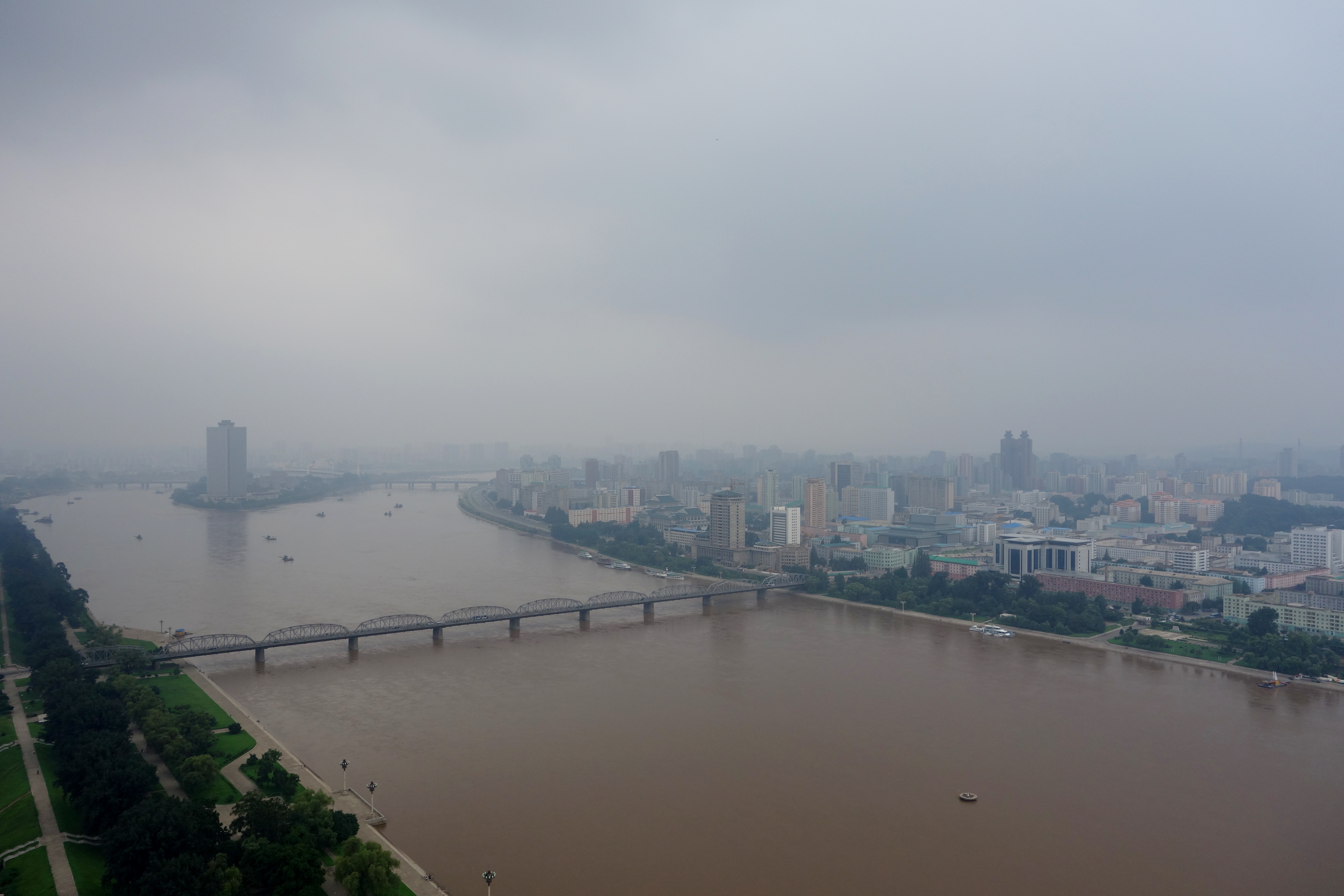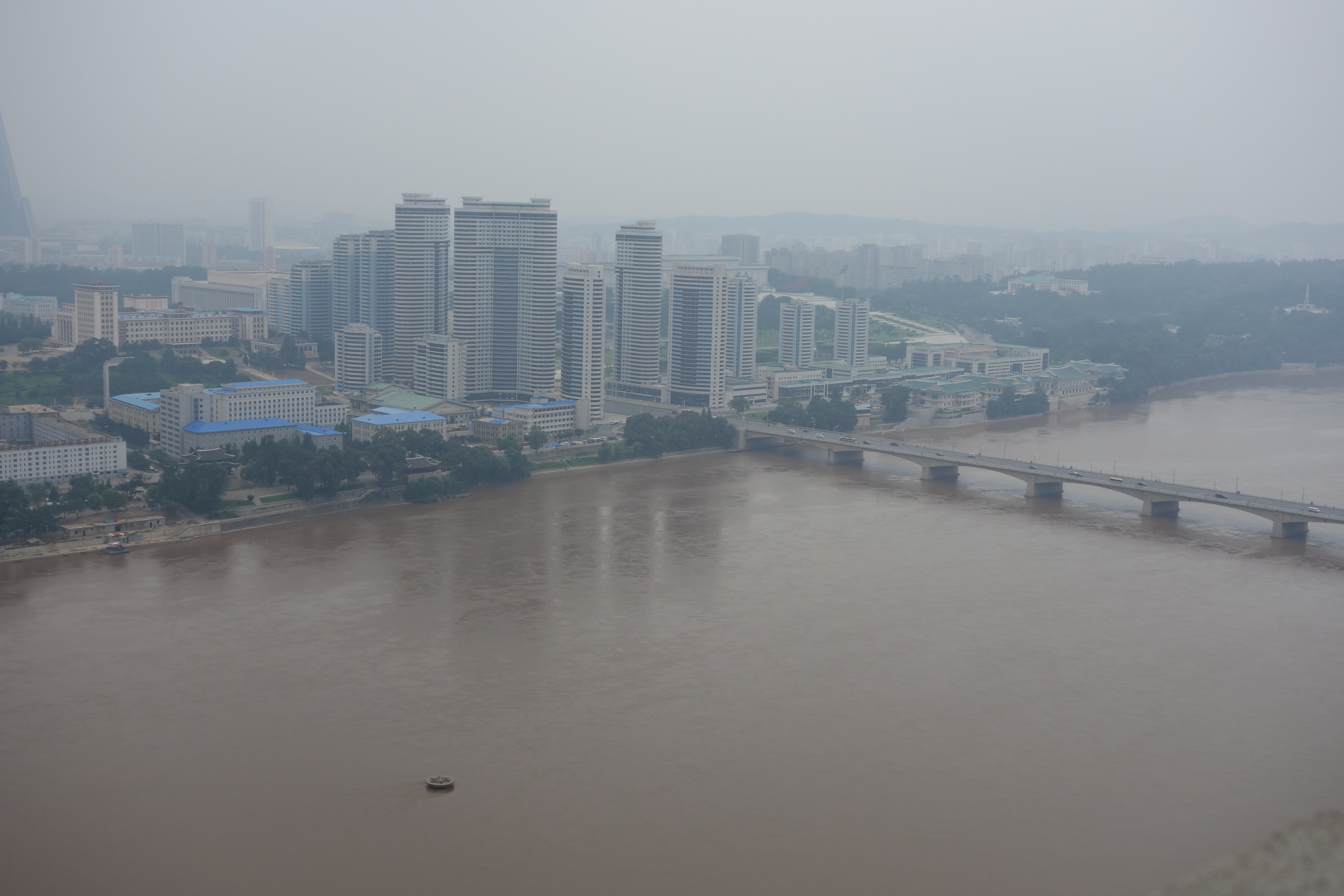 The view downriver to the island with the Yanggakdo Hotel on it:
