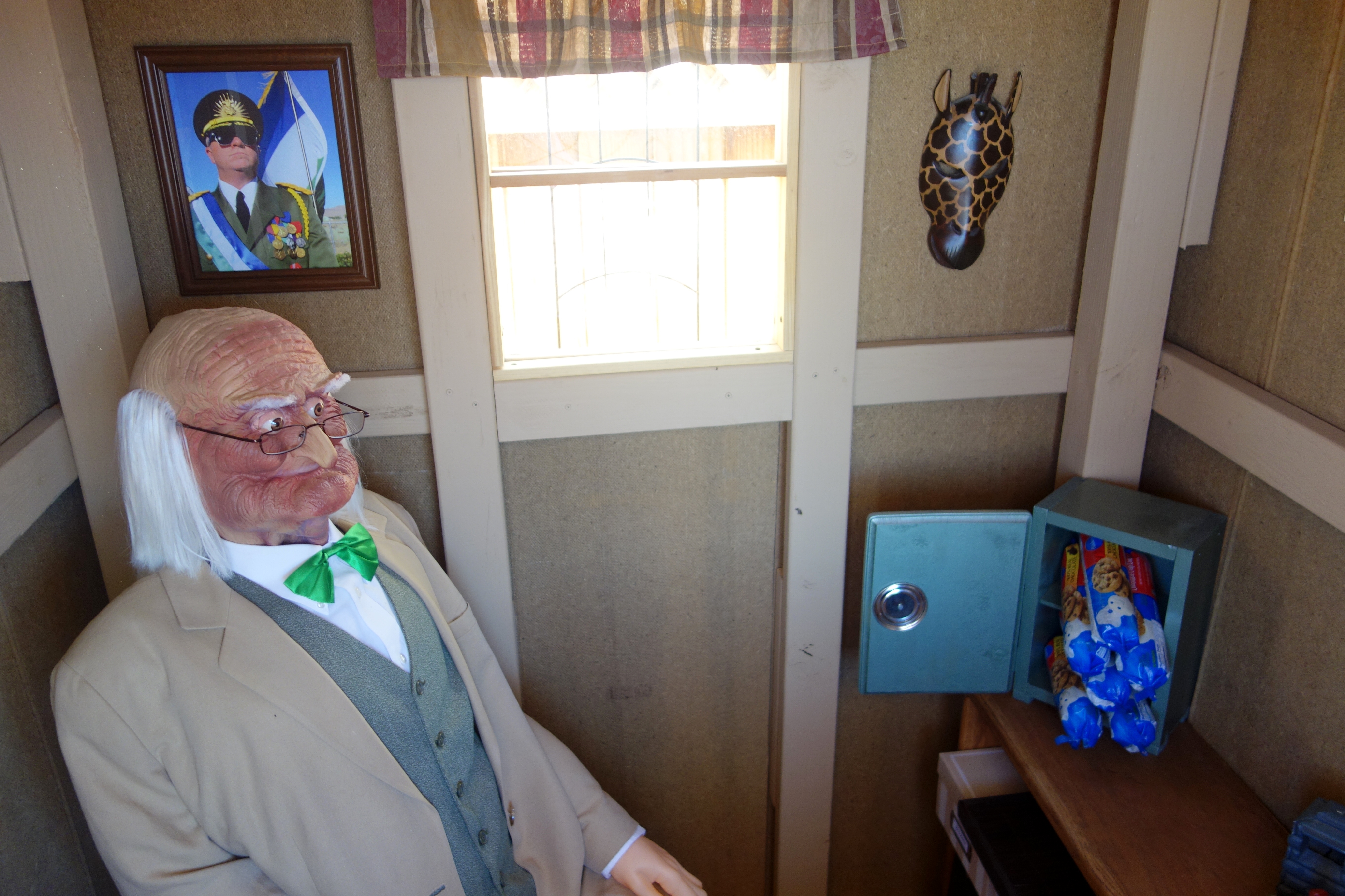 Behind these, one can find the Office of the President… His Excellency, standing at the entrance of his office, is telling us a story about Molossia in this picture below: