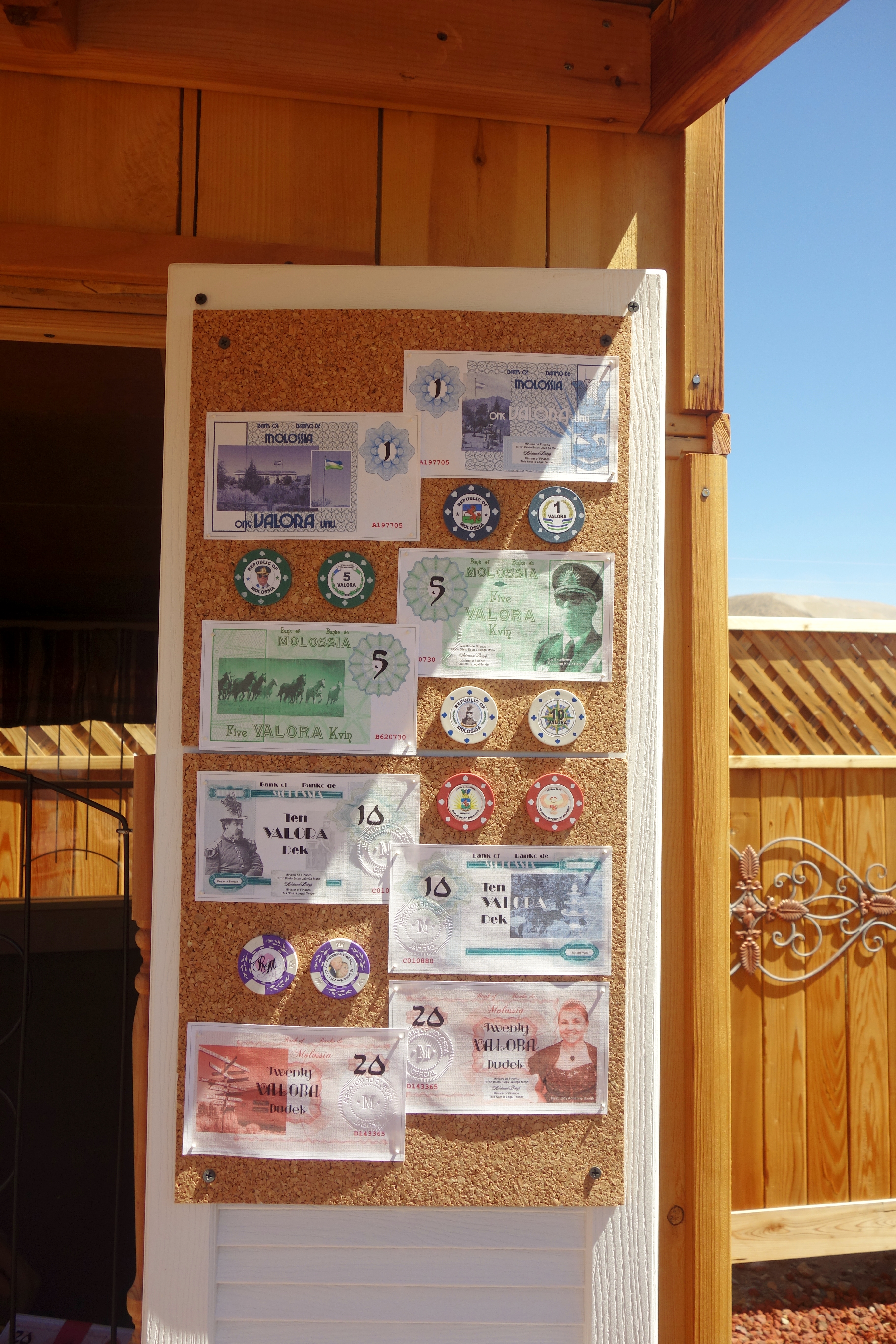 Molossian currency, the valora, is a “hard currency” in that it is backed by a physical asset. In the past, hard currencies have traditionally been linked to gold. However, Molossia is more sophisticated and rather than having its currency backed by a relatively useless and heavy mineral, the Molossian currency is backed by cookie dough. You can see some in the vault to the right of the banker, Herman: