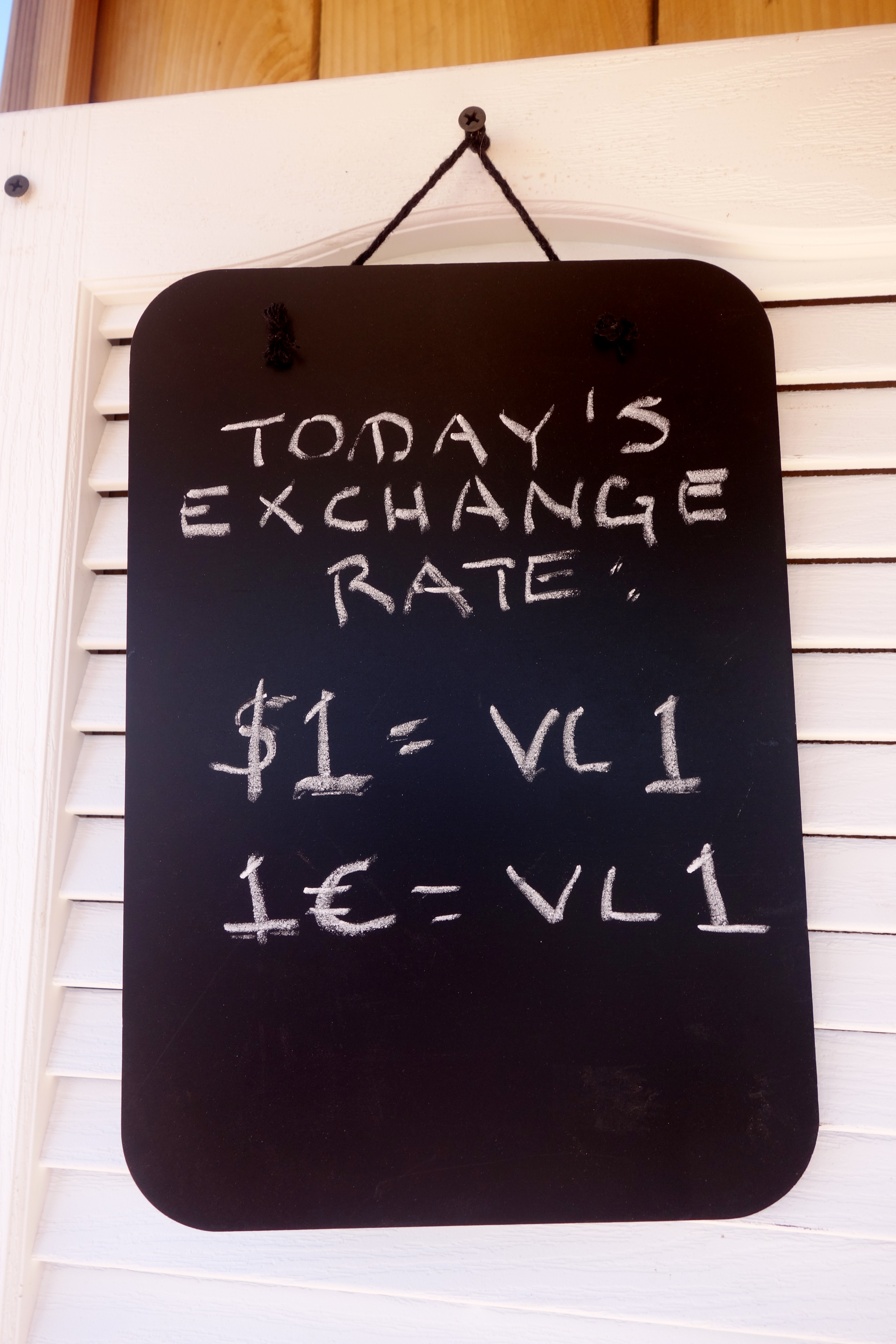 A sign on the wall of the bank will list the current dollar/valora exchange rate: