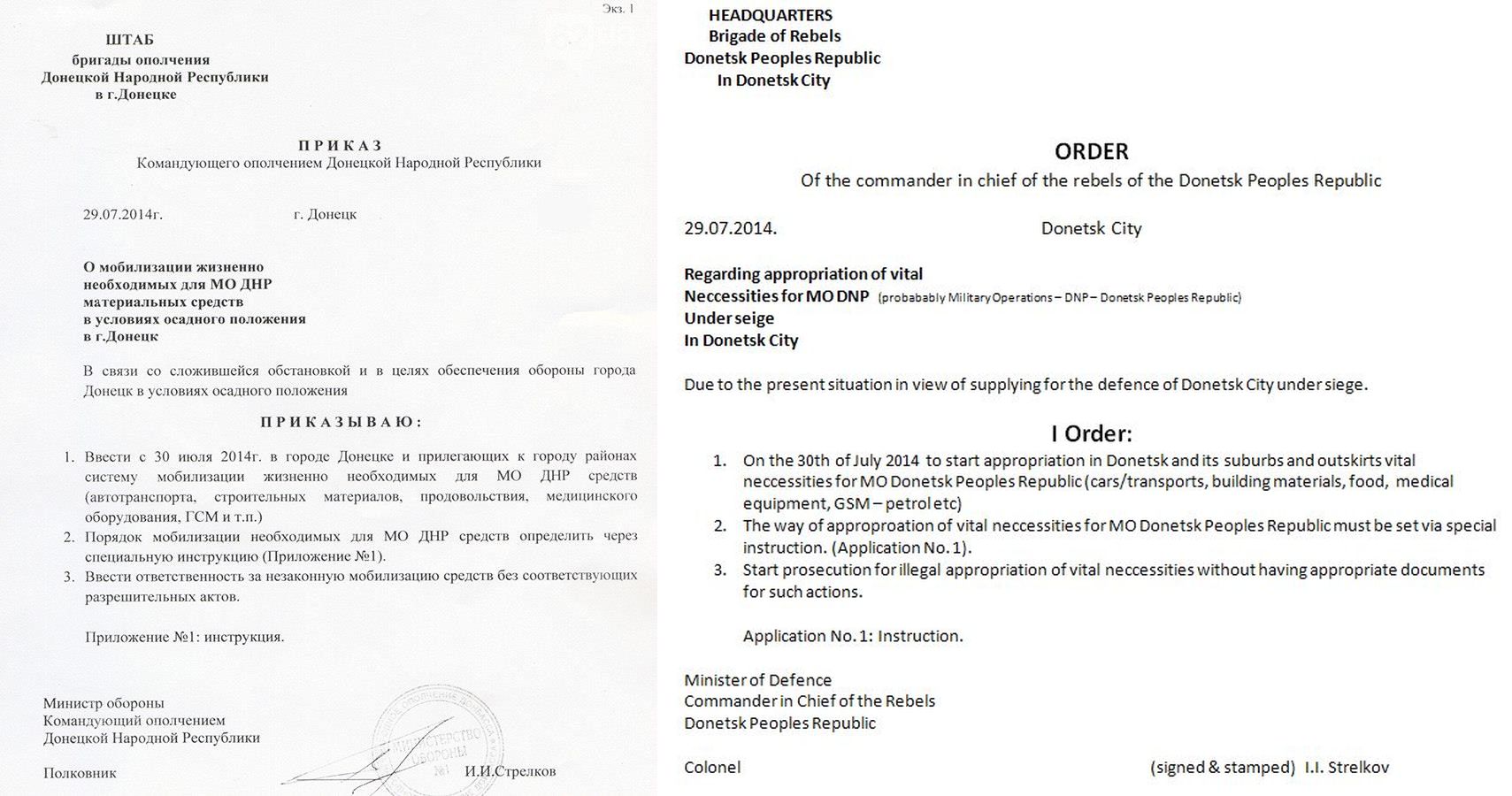 The below is a particularly interesting gem that comes courtesy of our friend on the ground in the Donetsk People’s Republic, Emir… It is an order signed by Igor Strelkov aka Igor Girkin authorizing looting by his forces inside the Donetsk People’s Republic. Emir has provided us with a side-by-side translation of the Russian and the English:
