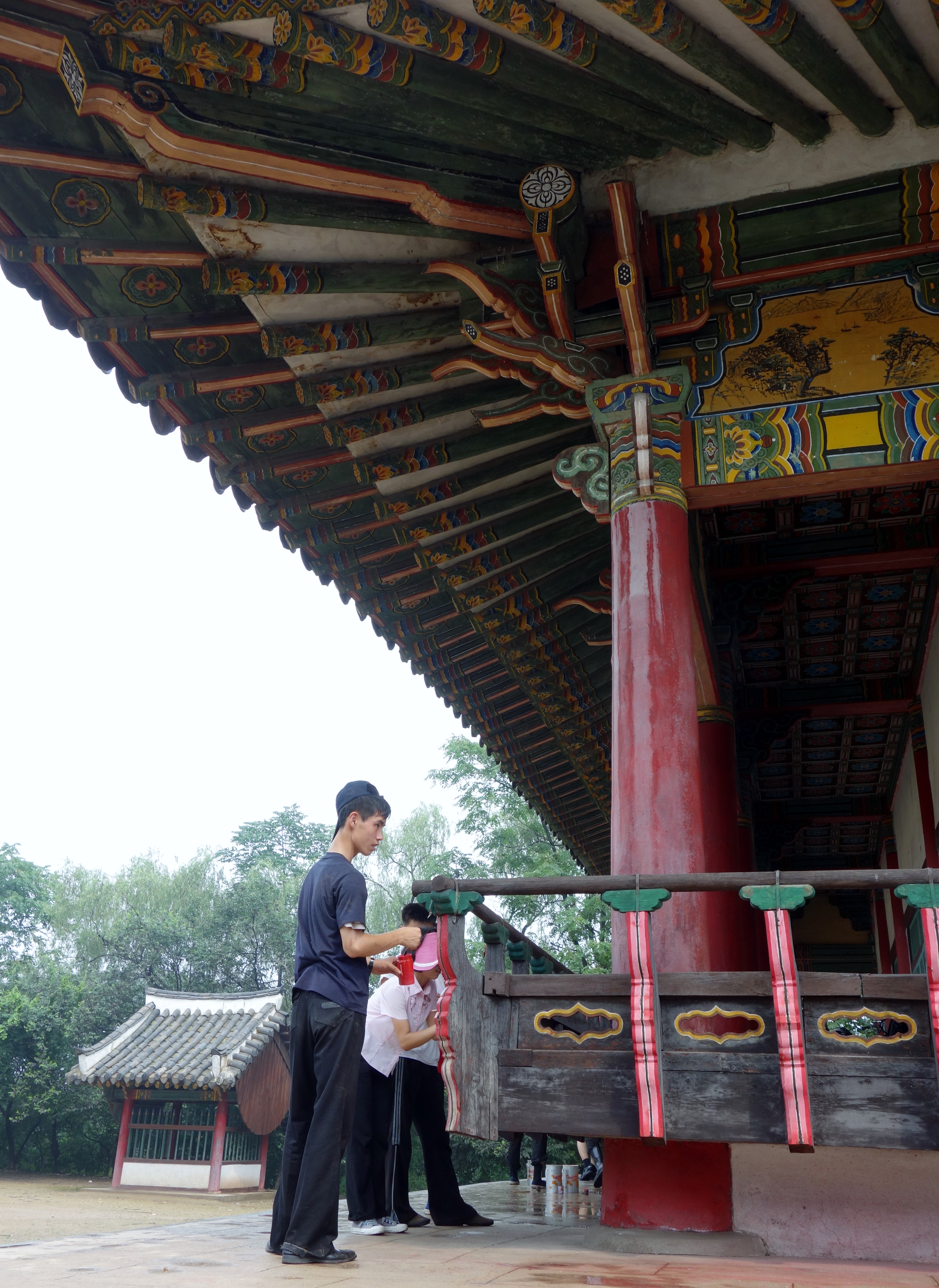Here some of the workers at the studio are sprucing up the “ancient Korean town” film set: