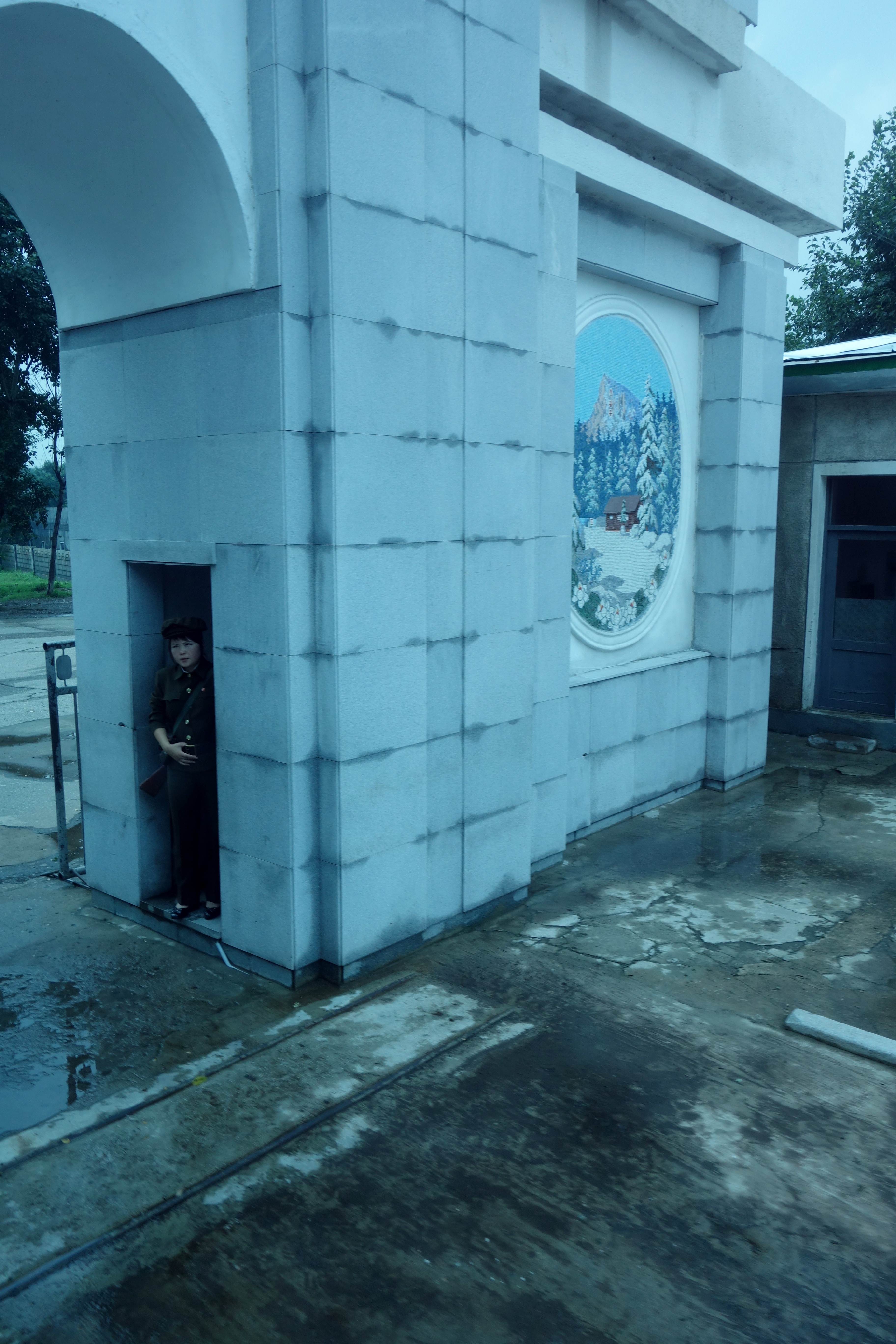 An armed guard at the entrance to Pyongyang Film Studios, the state-run film production facility of North Korea: